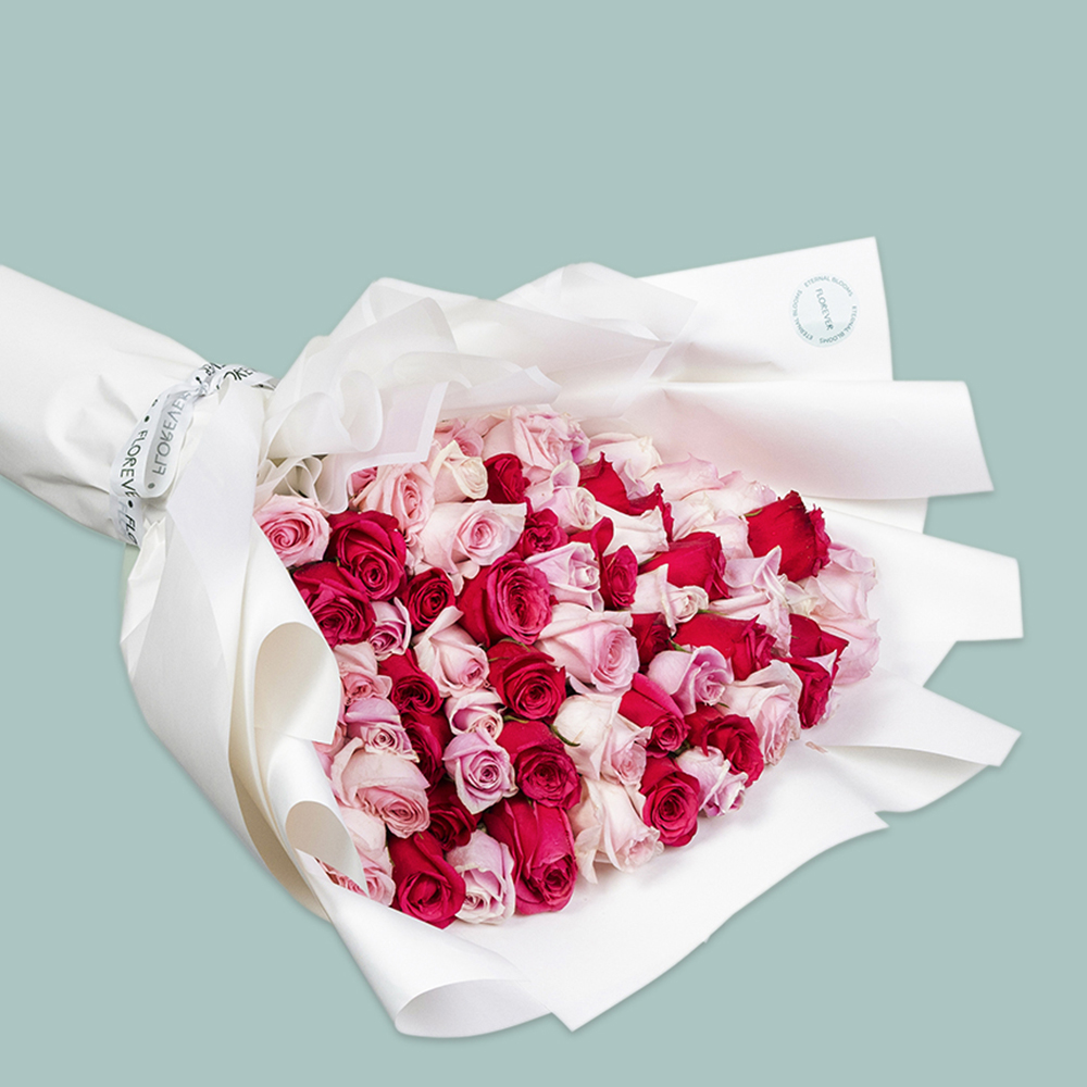 باقة يد رائعة وكبيرة تحتوي على 75 زهرة جوري وردية بدرجات مختلفة.