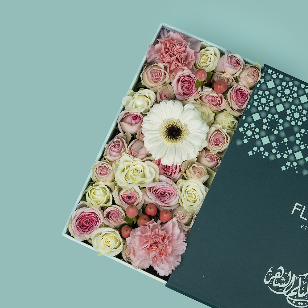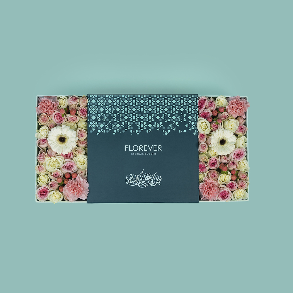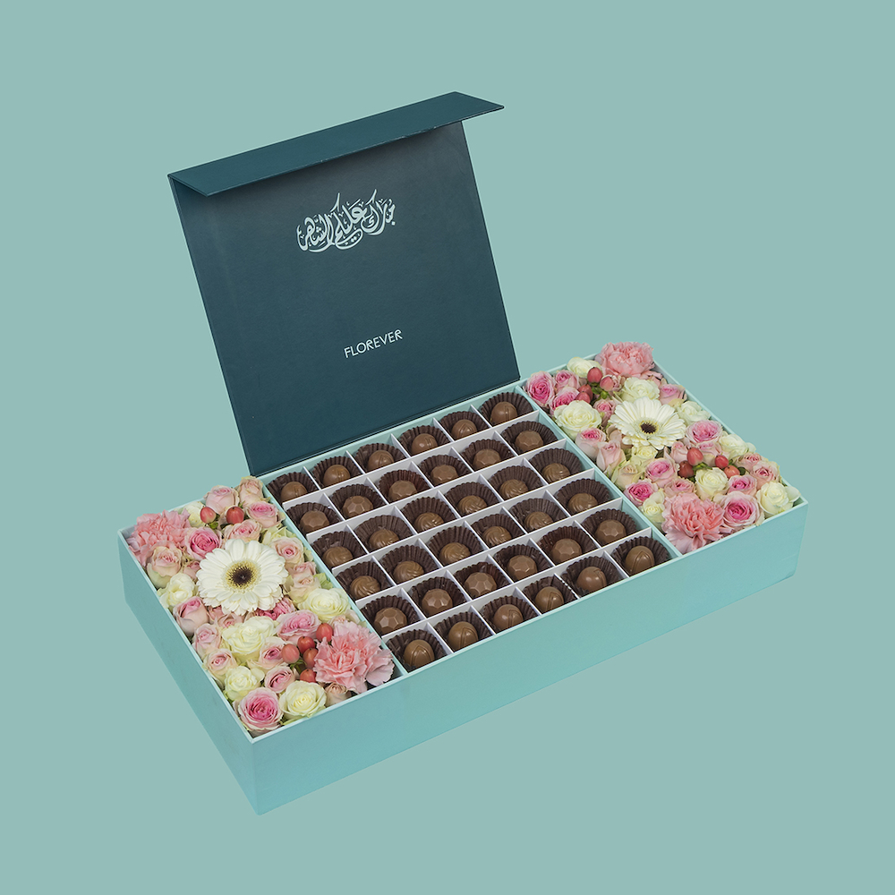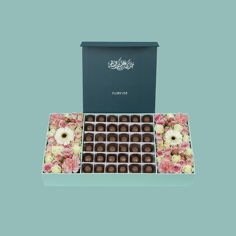 صندوق رمضاني أنيق يجمع بين 36 قطعة شوكولاتة فاخرة وتنسيق وردي وأبيض ناعم من زهور الجوري، البيبي جوري، الجيربيرا والكارنيشن يضفي أجواء دافئة على جلسات رمضان. تصميم راقي مناسب للهدايا الراقية والزيارات الرمضانية، يجمع بين حلاوة الشوكولاتة وجمال الزهور في تجربة فاخرة. مثالي للإهداء أو لتزيين موائد الإفطار والسحور بأسلوب أنيق من فلوريفر.