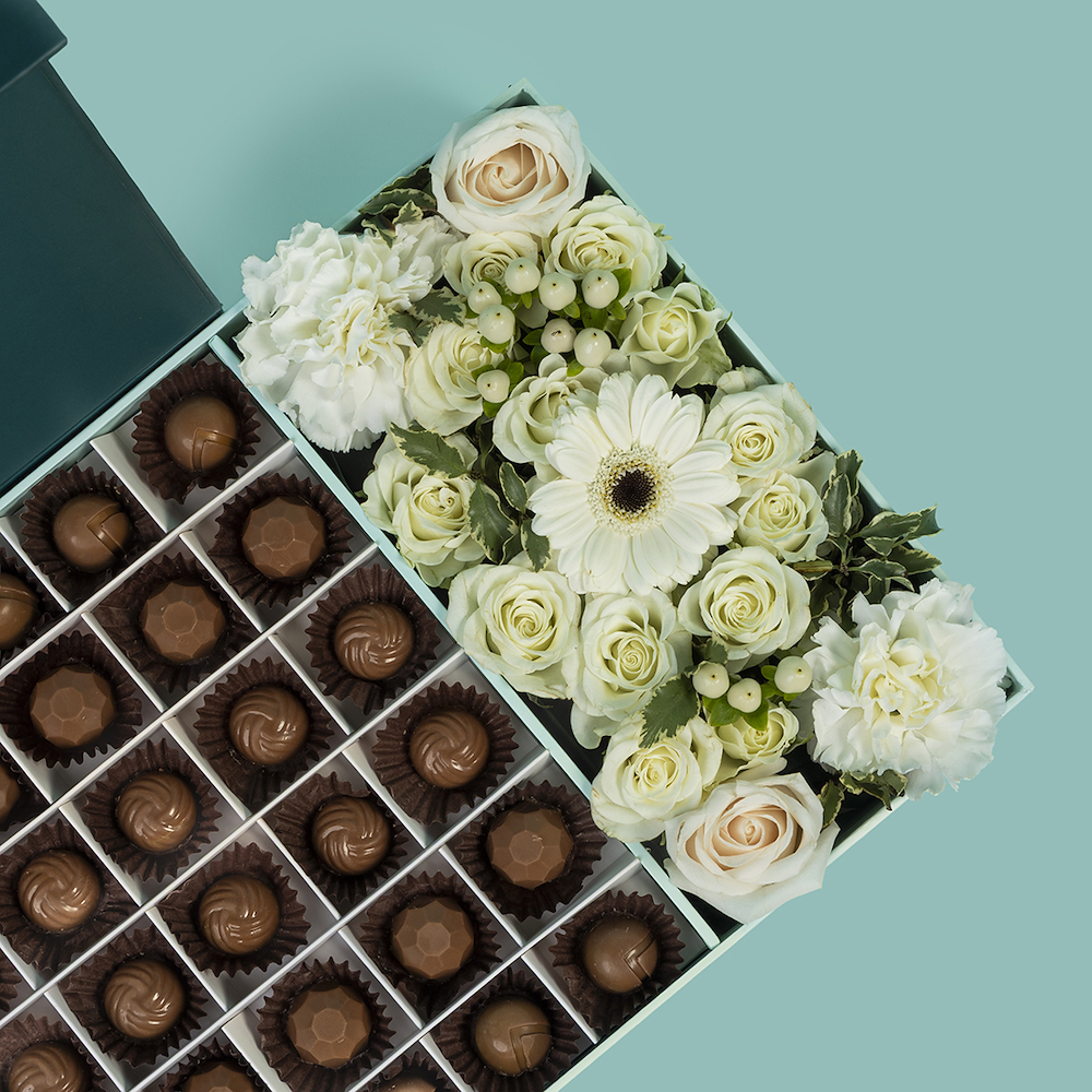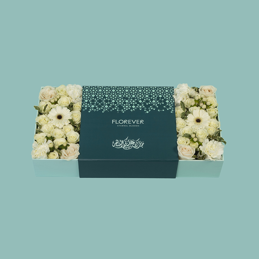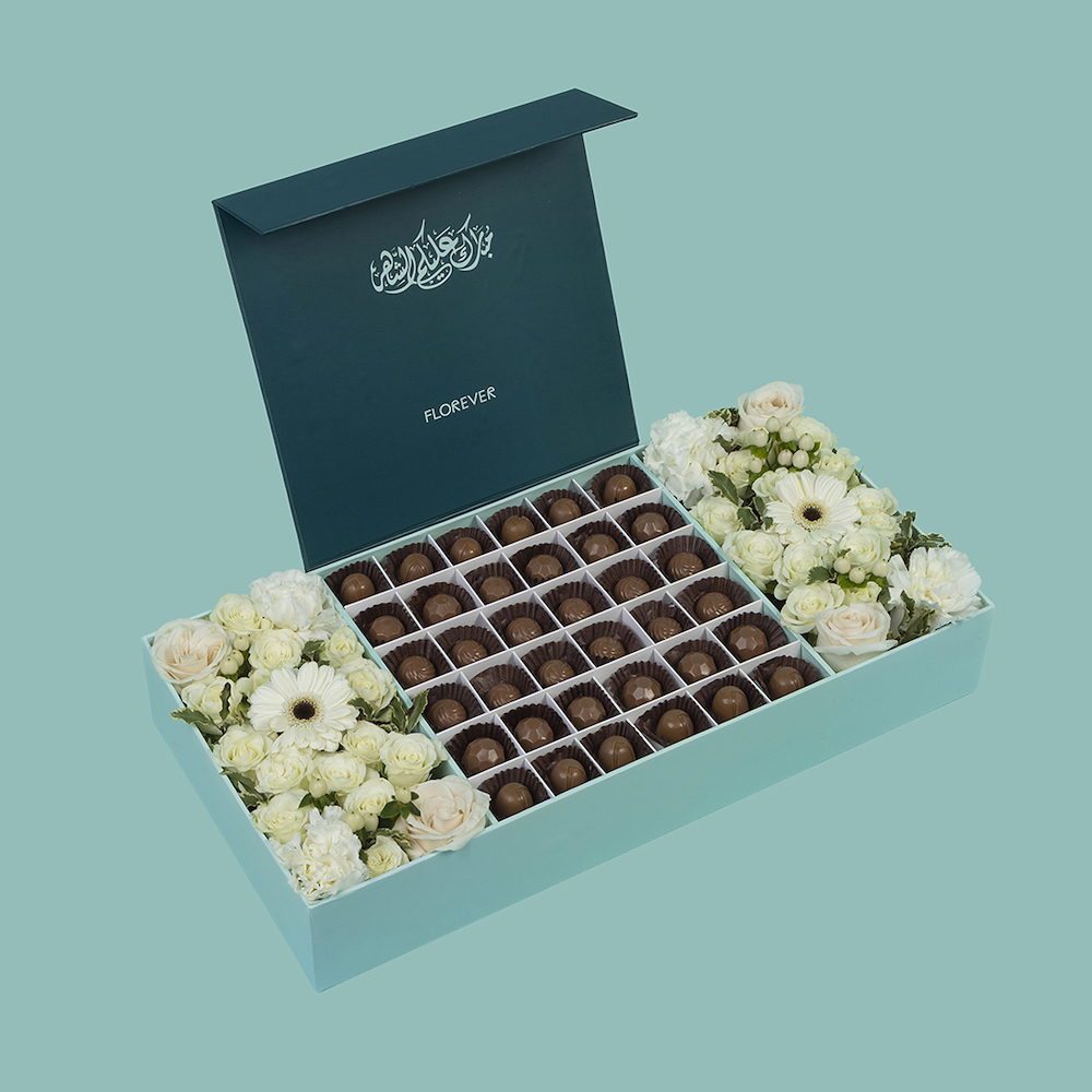 صندوق رمضاني فاخر يضم 36 قطعة شوكولاتة فاخرة مع تنسيق زهور جوري، بيبي جوري، جيربيرا وكارنيشن بيضاء راقية تعكس النقاء والأناقة في أجواء الشهر الفضيل. إختيار مثالي للهدايا الرسمية والزيارات الراقية خلال رمضان، حيث يجمع بين الذوق الرفيع والتصميم الهادئ. لمسة أنيقة تضيف صفاء وفخامة لكل مناسبة رمضانية.