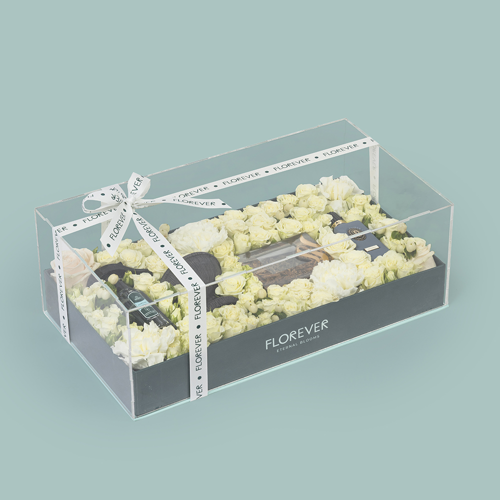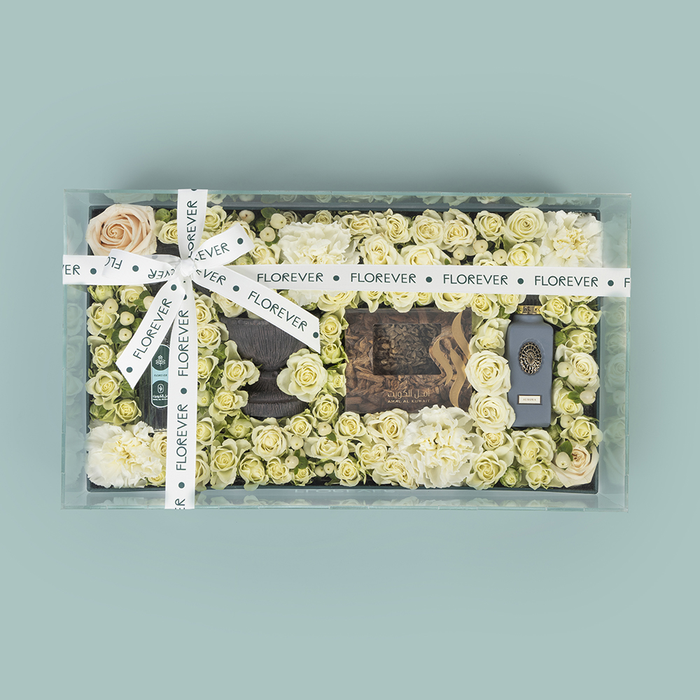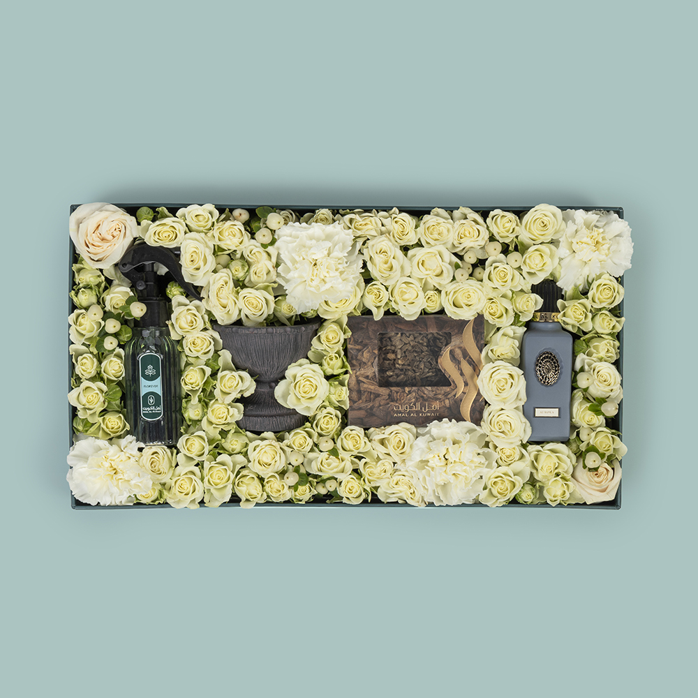 هدية تعبر عن كل شيء. باقة من زهور الجوري، البيبي جوري والكارنيشن، مع مبخر، بخور، مرش وعطر، في علبة واحدة. صممت لتضفي سحراً وإنتعاشاً وبهجة. مثالية لمن يحب الجمال بلمسة عطرية رقيقة. تفاصيل الهدية: - بخور هندي للإستعمال اليومي من أمل الكويت (12 جرام - 1 تولة). - مبخر من امل الكويت. - مرش فلوريفر من امل الكويت (100 مل). - عطر أورورا من أمل الكويت (30 مل).