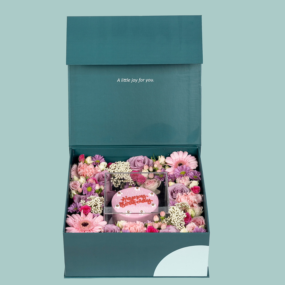 صندوق أنيق يحتوي على زهور الهايبريكم، البيبي جوري، الكارنيشن، الكريز والجيربيرا مع كيكة صغيرة بكتابة مخصصة باللغة الإنجليزية فقط.