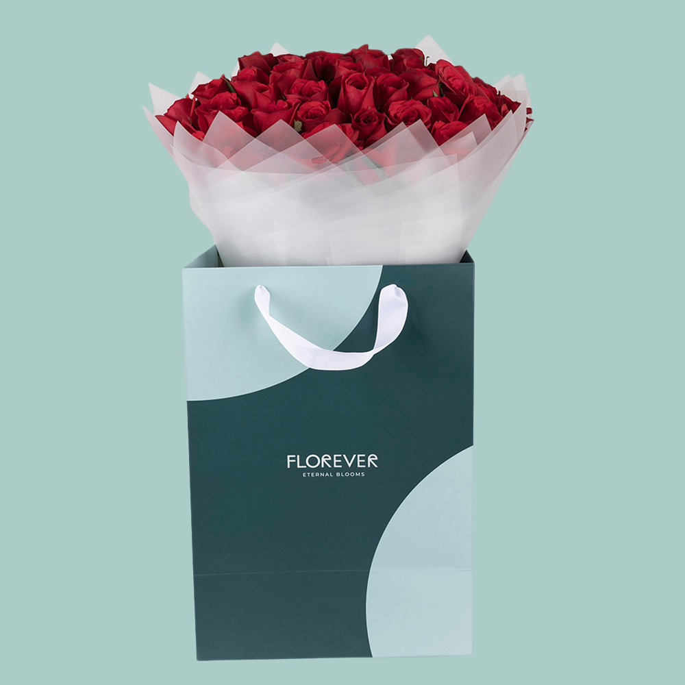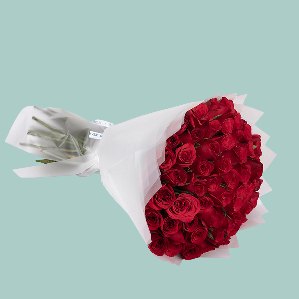باقة 50 زهرة جوري حمراء كبيرة، مرتبة لإضافة الجمال والسحر إلى أي مساحة.