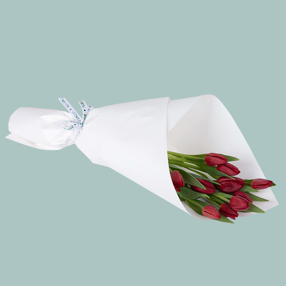 هذه الباقة تحتوي على زهور التوليب الأحمر مغلفة باللون الأبيض.