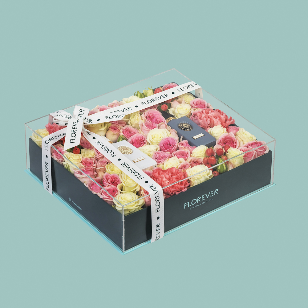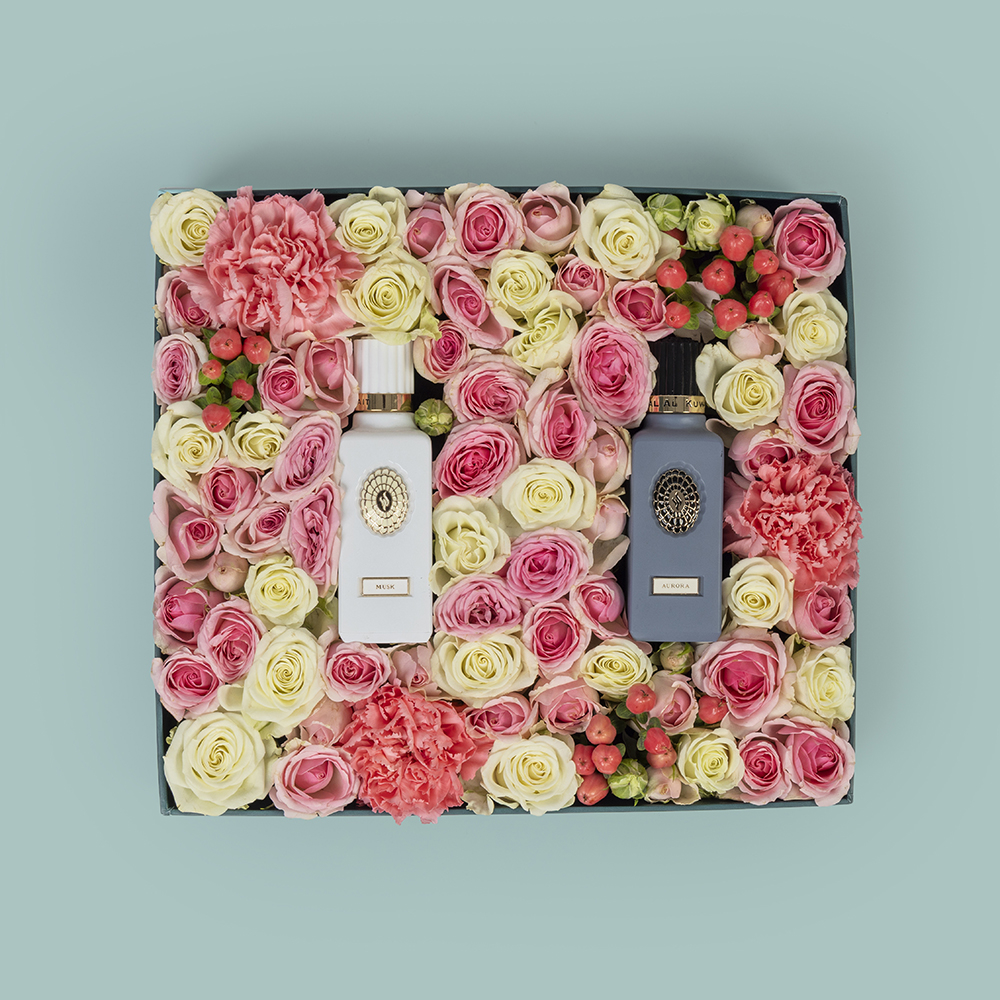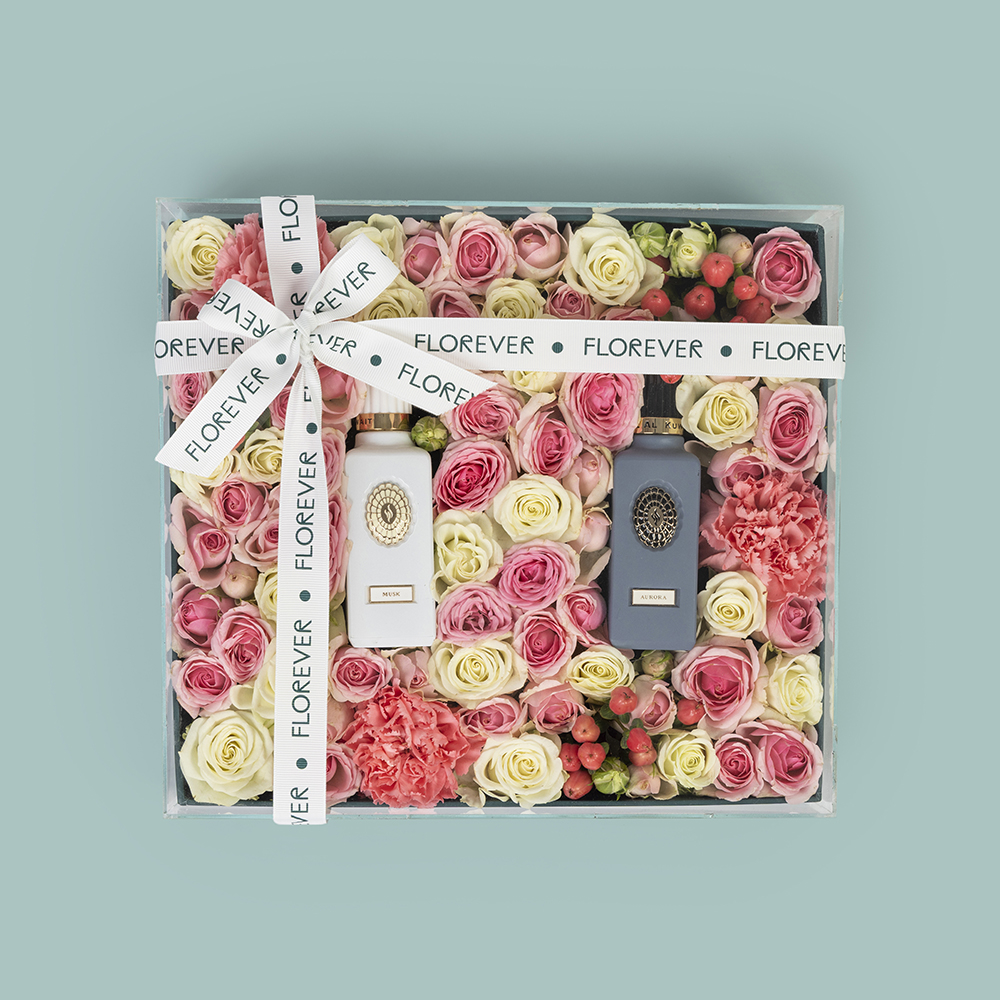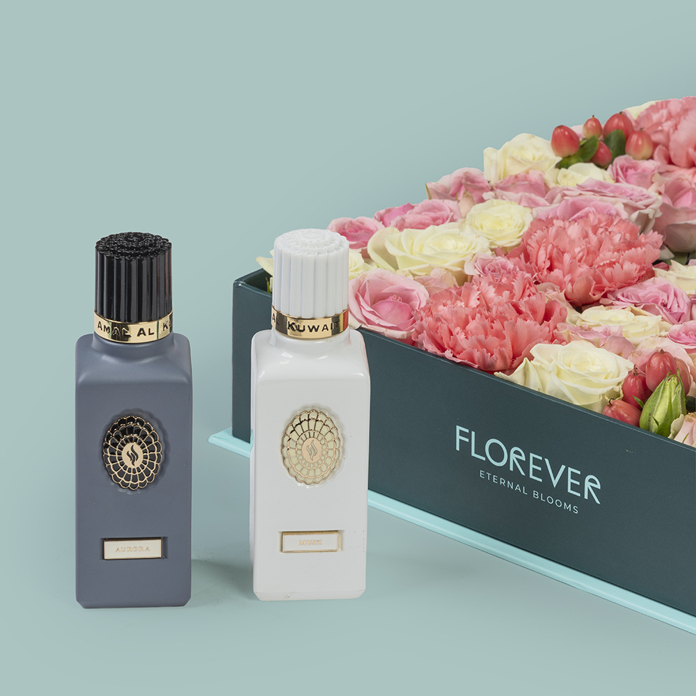 هدية تعبر عن كل شيء. باقة من زهور الجوري، البيبي جوري والكارنيشن، مع عطرين، في علبة واحدة. صممت لتضفي سحراً وإنتعاشاً وبهجة. مثالية لمن يحب الجمال بلمسة عطرية رقيقة. تفاصيل العطور: - عطر مسك من أمل الكويت (100 مل). - عطر أورورا من أمل الكويت (100 مل).