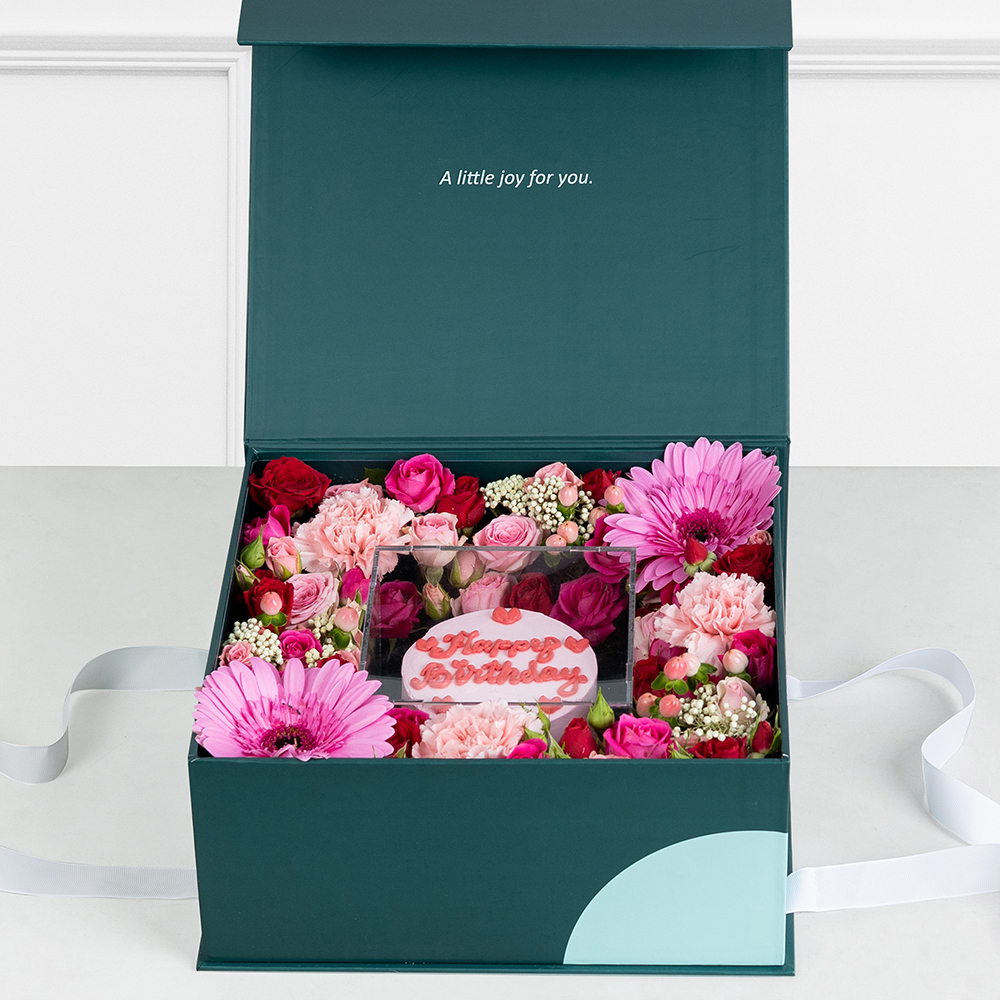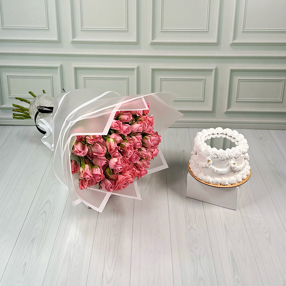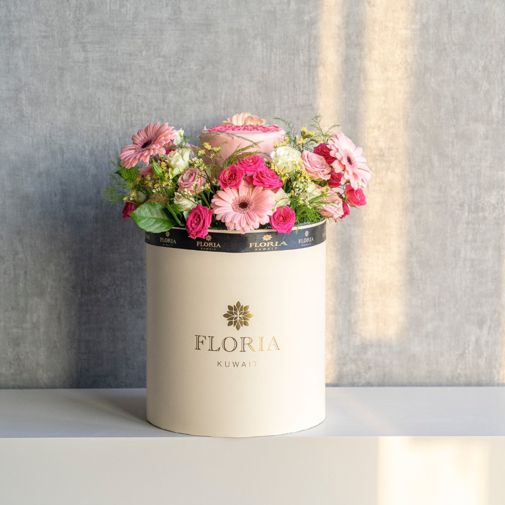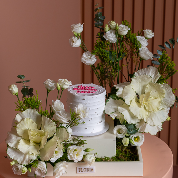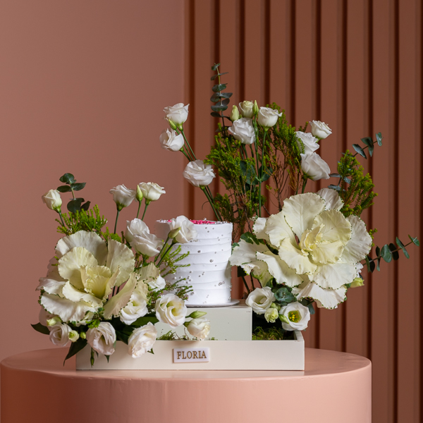 هذا الستاند يحتوي على زهور الإستوما مع كيكة.