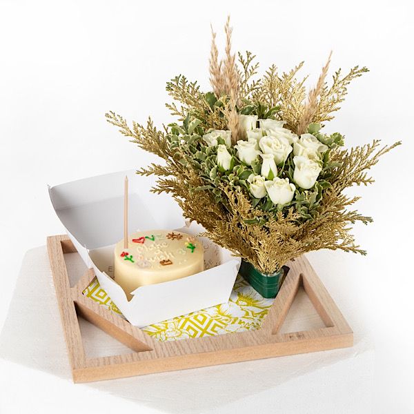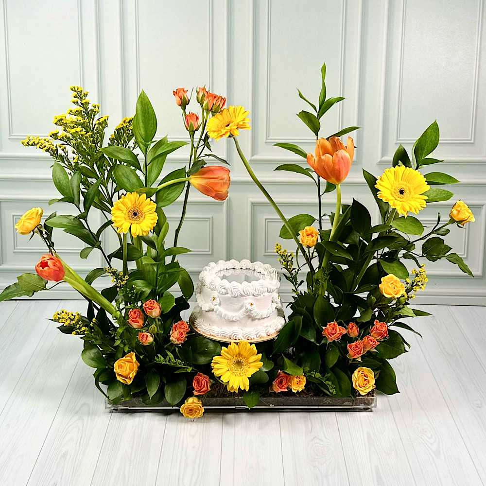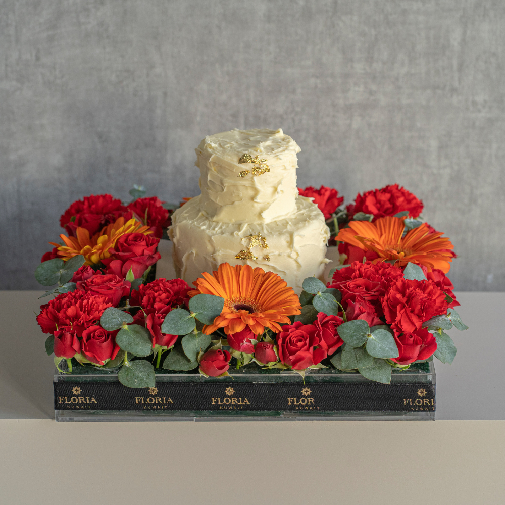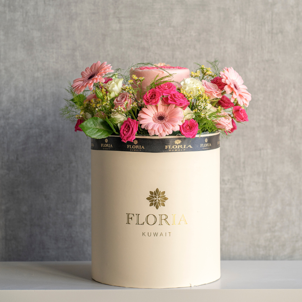 هذا اليوكس يحتوي على الجيربيرا، والجوري مع كيكة.
