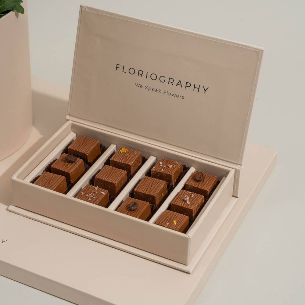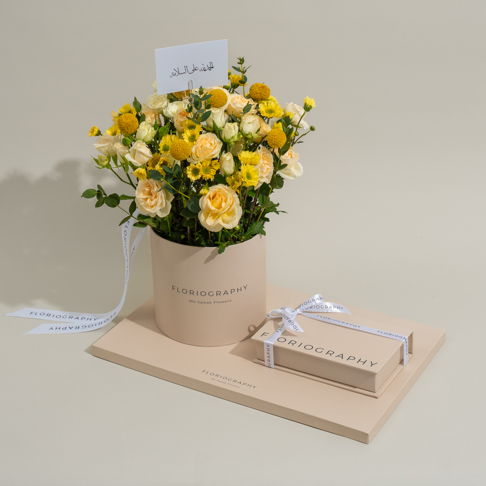 صينية مميزة تحتوي على باقة من أزهار البيبي روز والكريز مع علبة من الشوكولاتة المختارة.