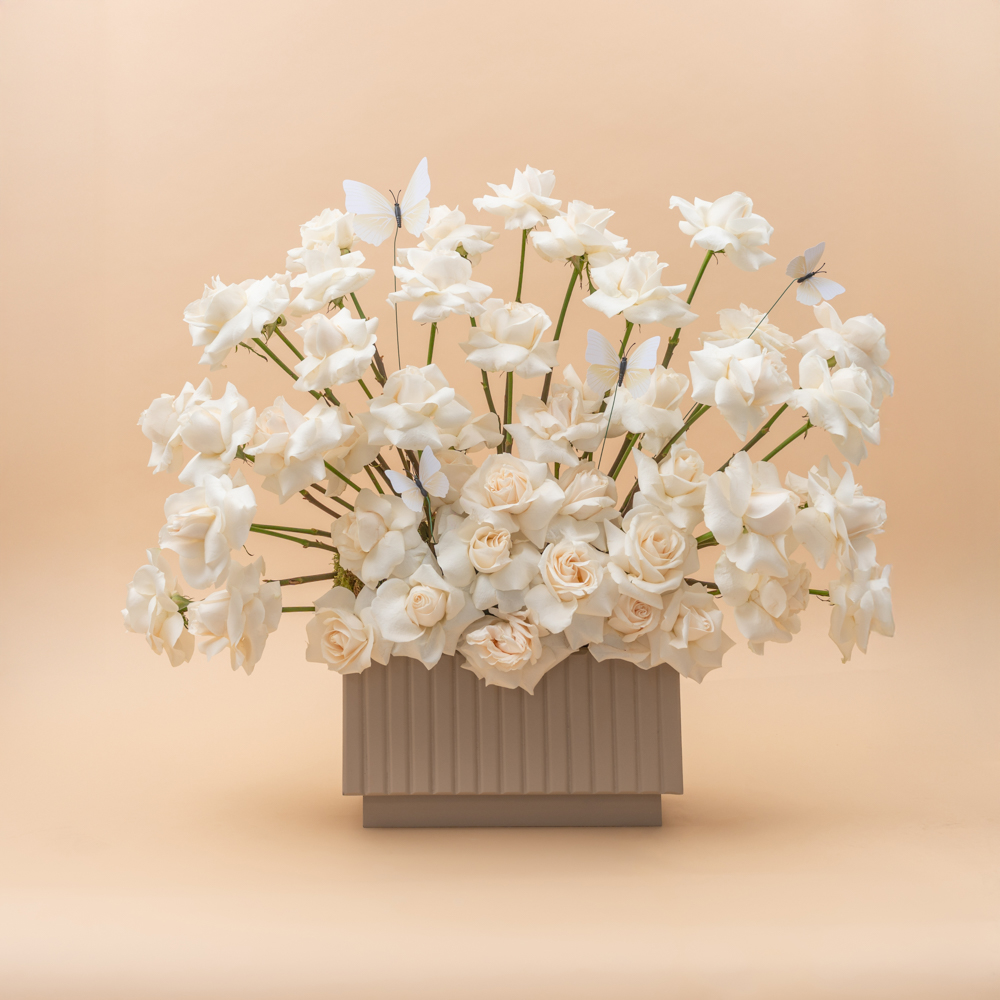 فازة خشبية تحتوي على الجوري وبعض الفراشات.