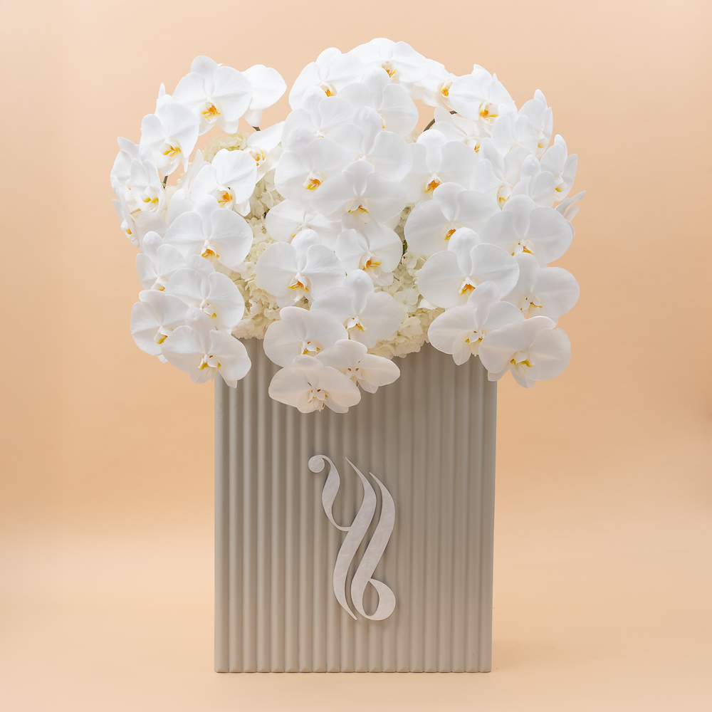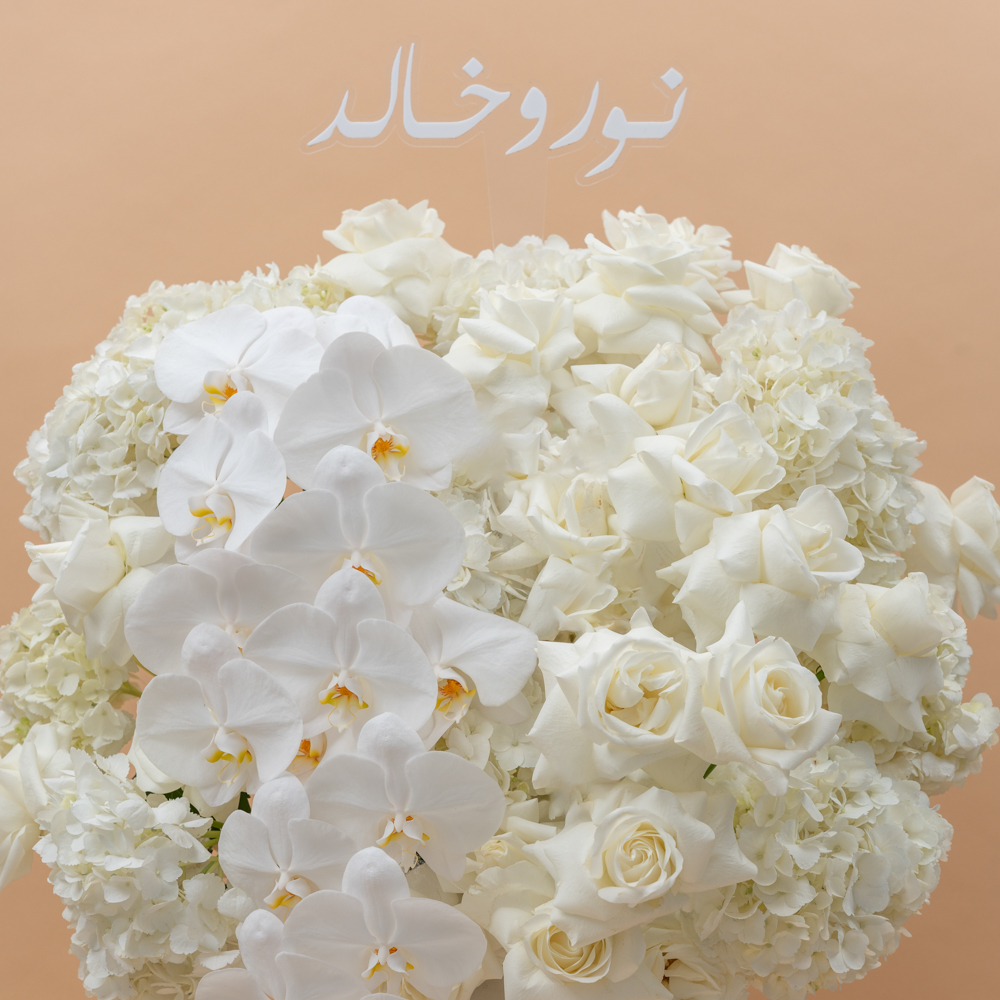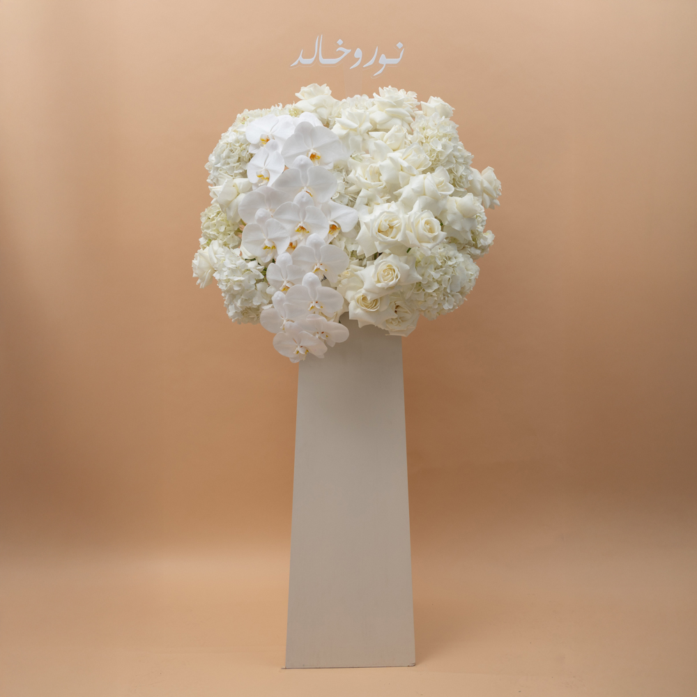 ستاند أنيق مخصص مليئ بأزهار الكوبية، الجوري والفلاينوبسيس كت.