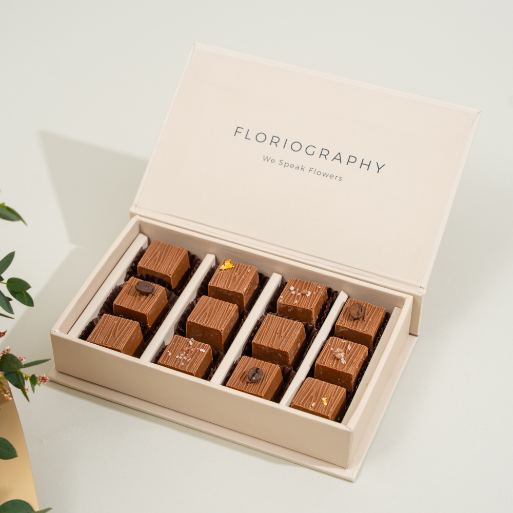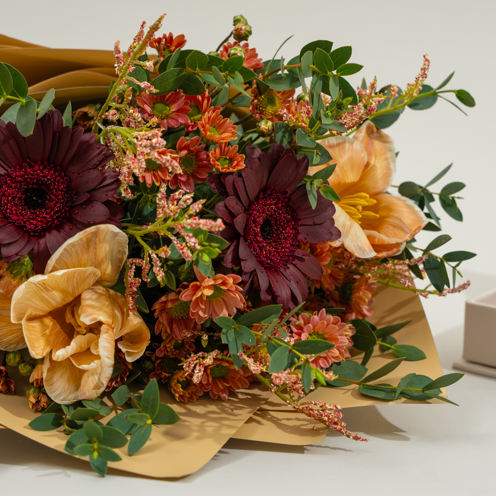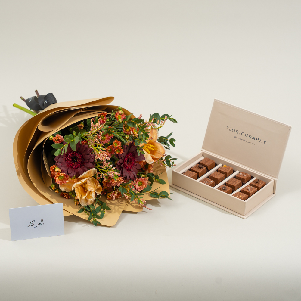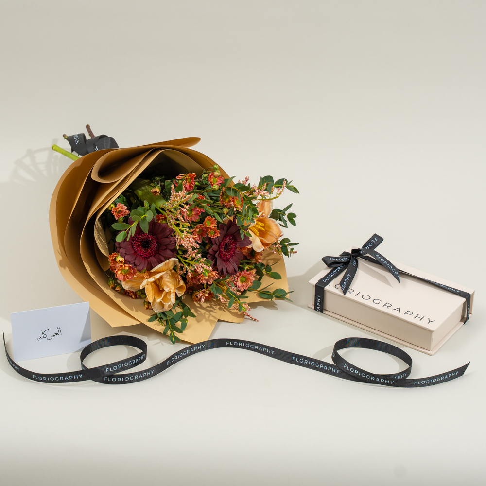 باقة جميلة تتميز بأزهار الجربيرا، التوليب والكريز مع علبة من الشوكولاتة المختارة.