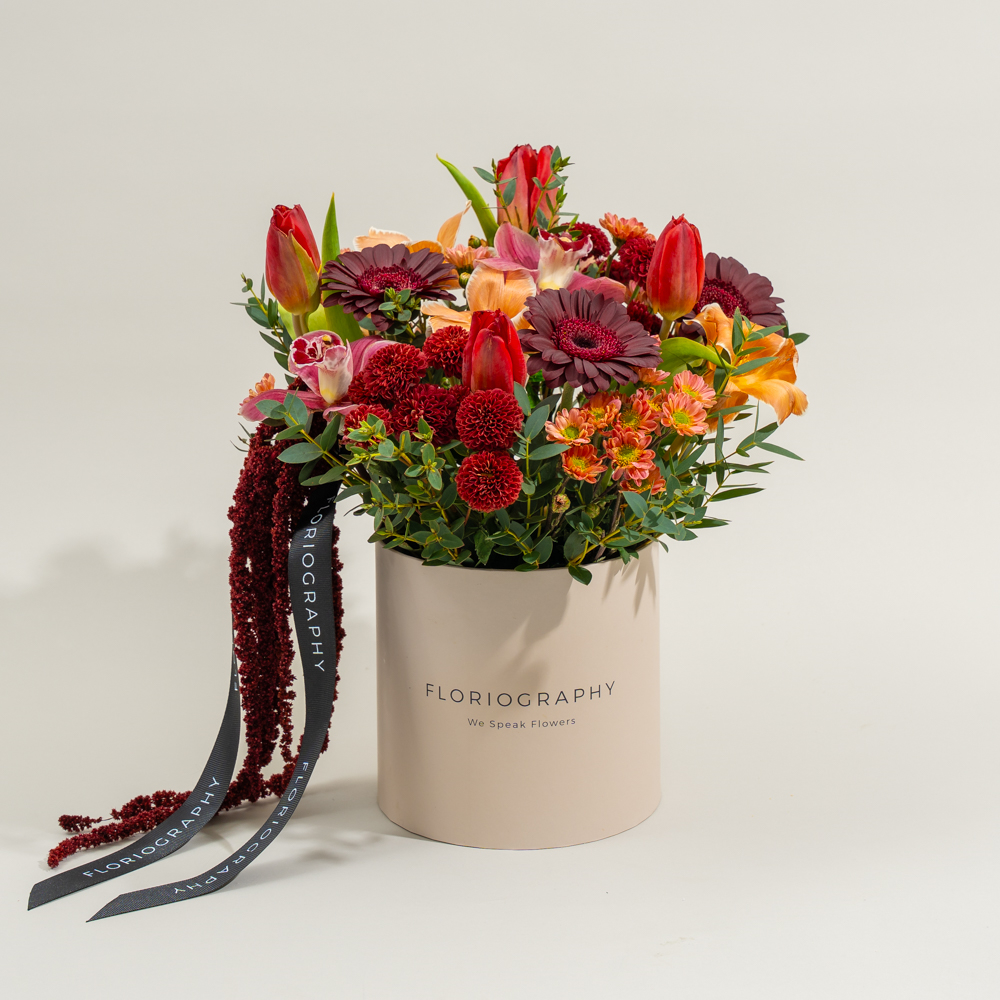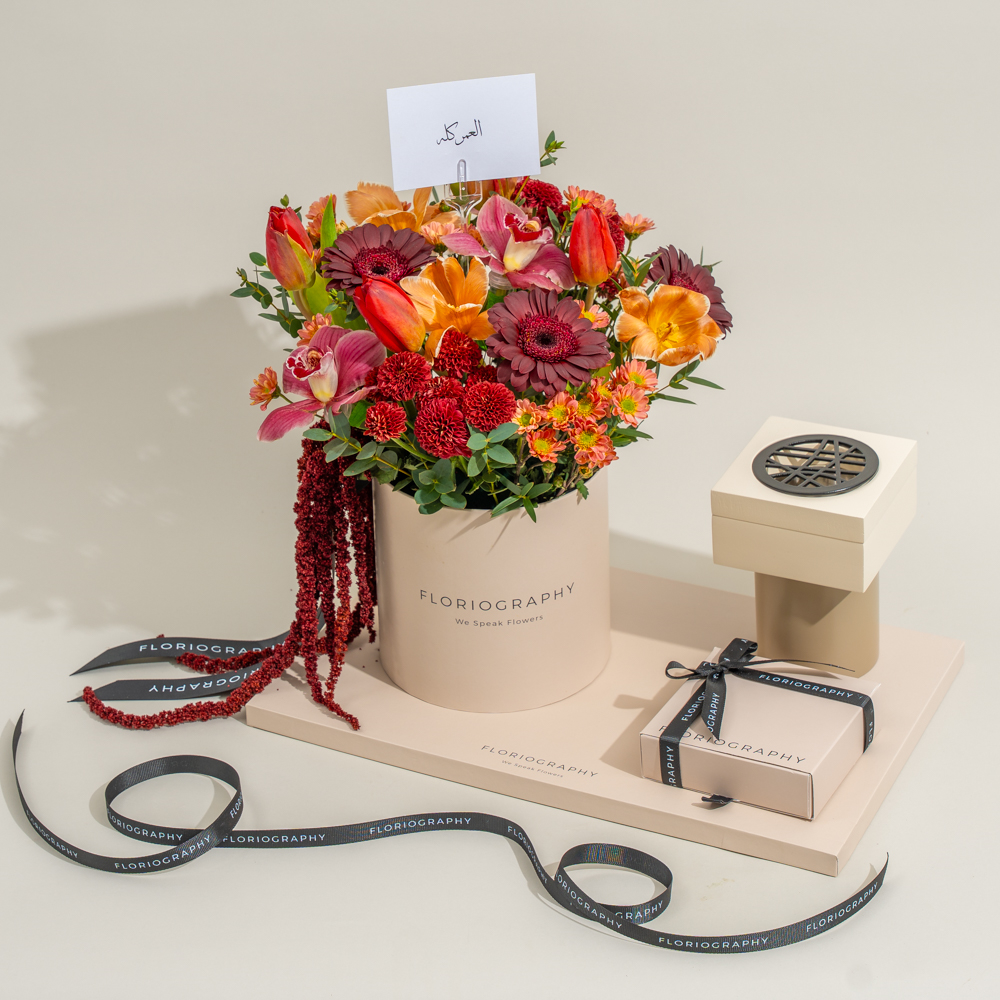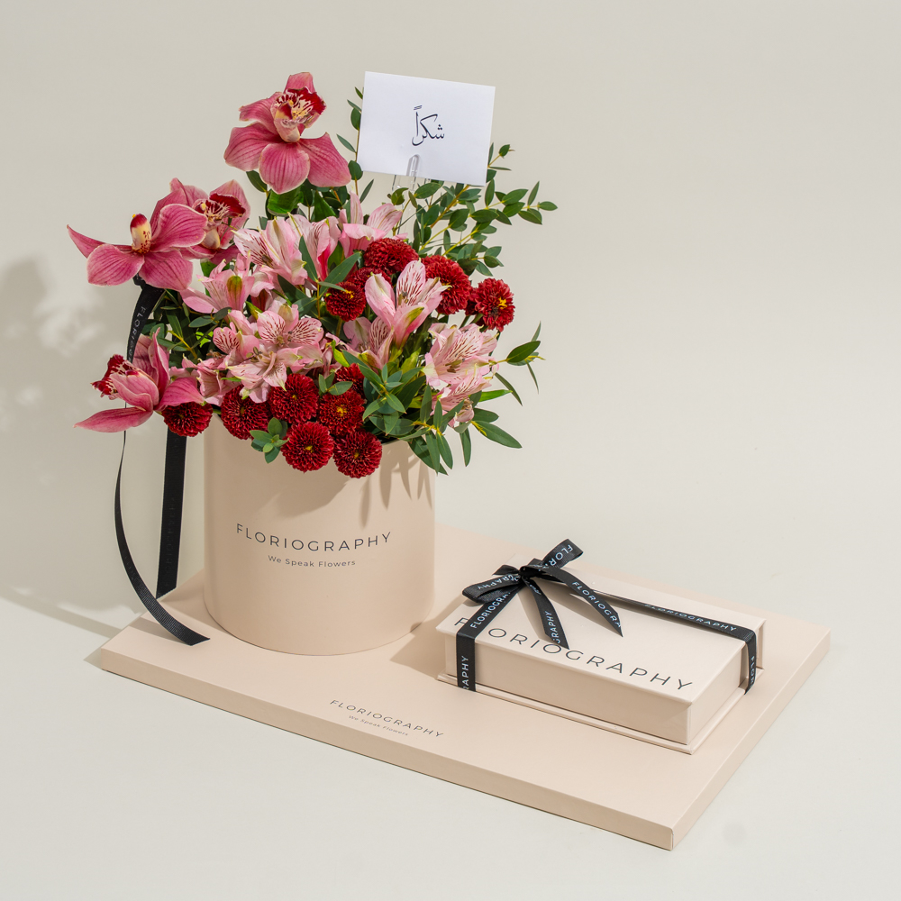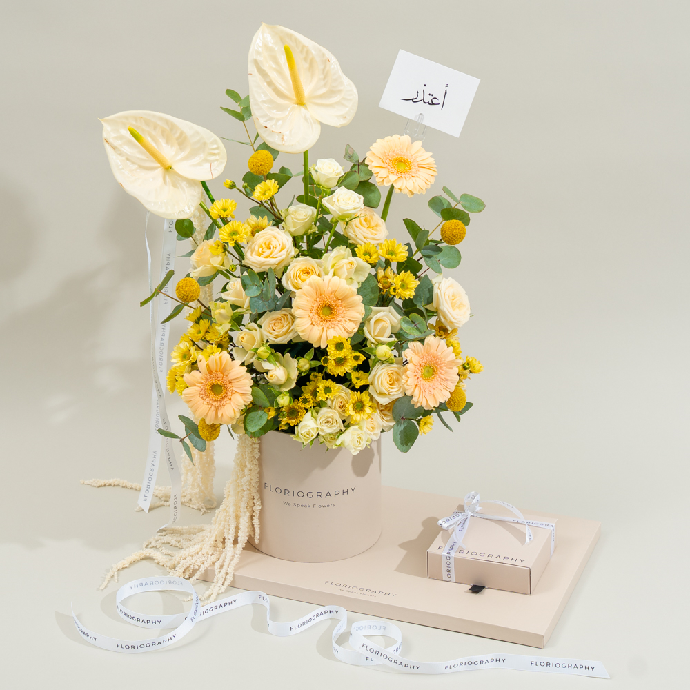 صينية فاخرة تحتوي على باقة من زهور الجيربيرا الخوخية، والبيبي جوري البيضاء وأوراق الأوكالبتوس مع علبة من الشوكولاتة المشكلة.