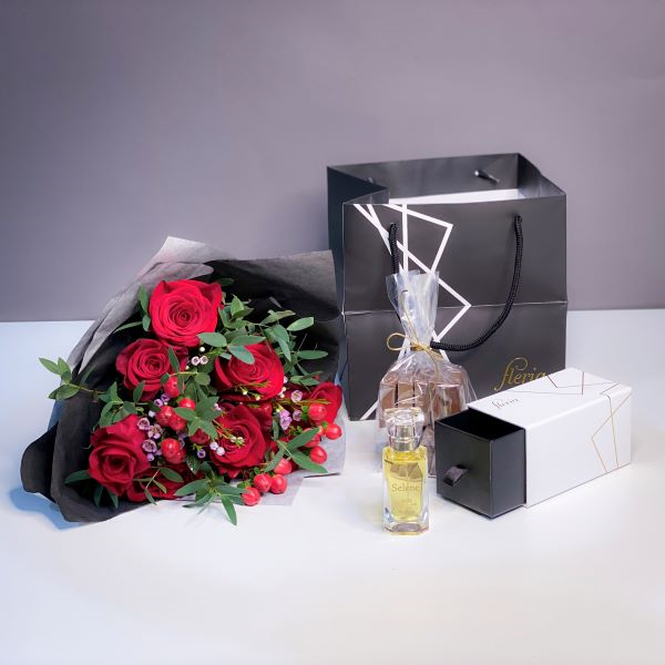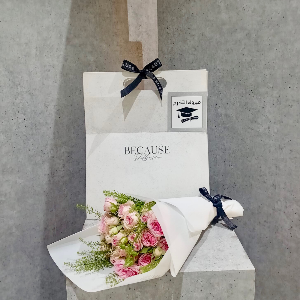 باقة تحتوي على البيبي جوري الوردي وأوراق الأوكالبتوس الذهبية مع علبة من الشوكولاتة البلجيكية وعطر.