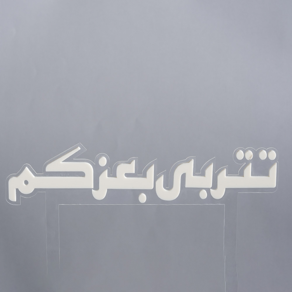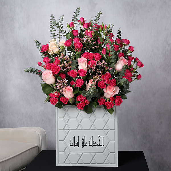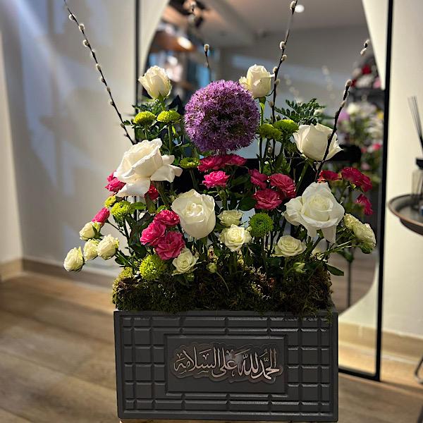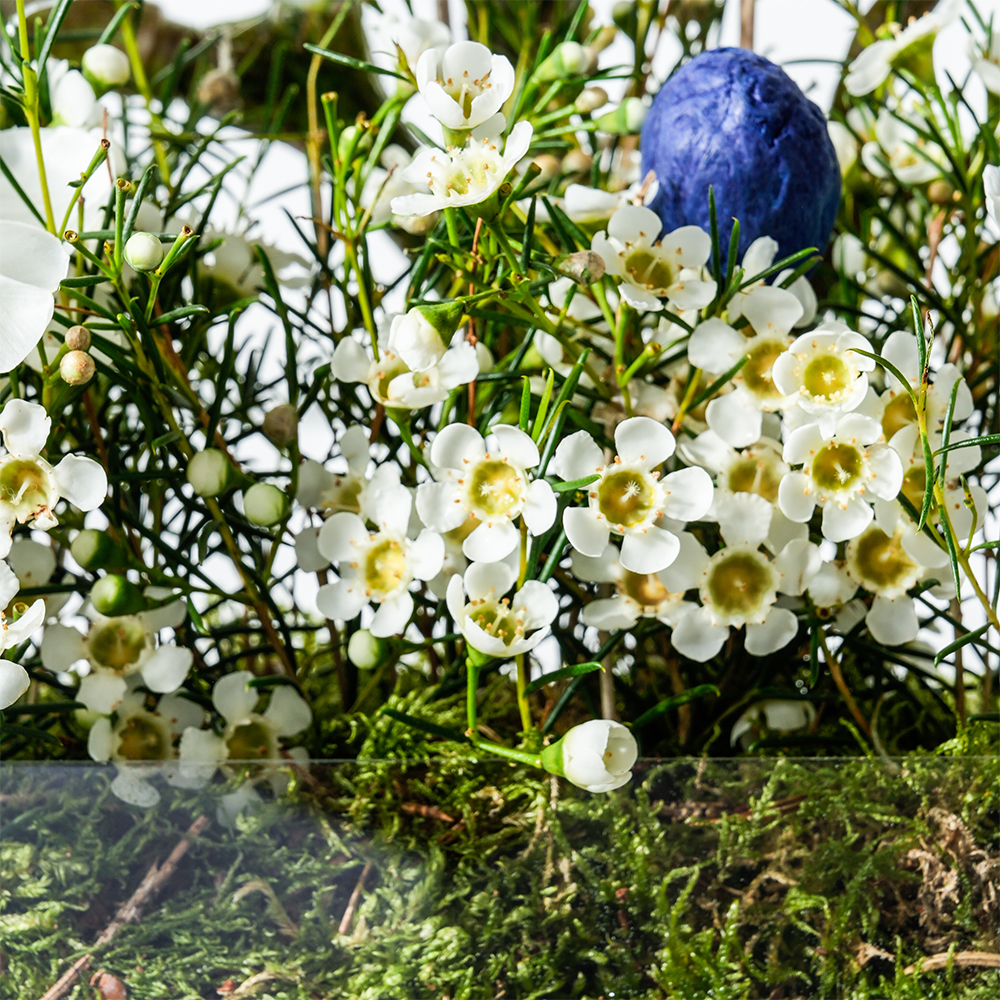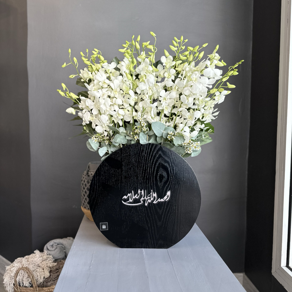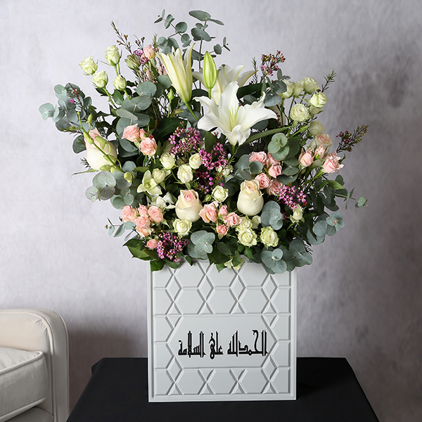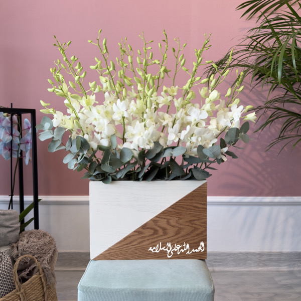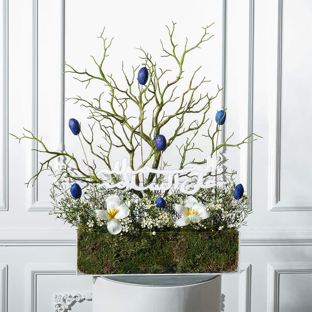 علبة من الأكريليك مرتبة بزهور التوليب البيضاء مع إكسسوارات أخرى.