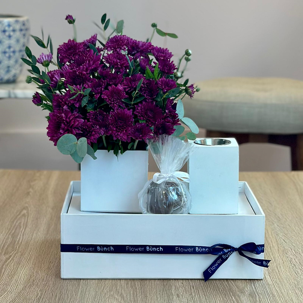 باقة تحتوي على زهور الكريز الأرجوانية مع الشوكولاتة ومبخر.