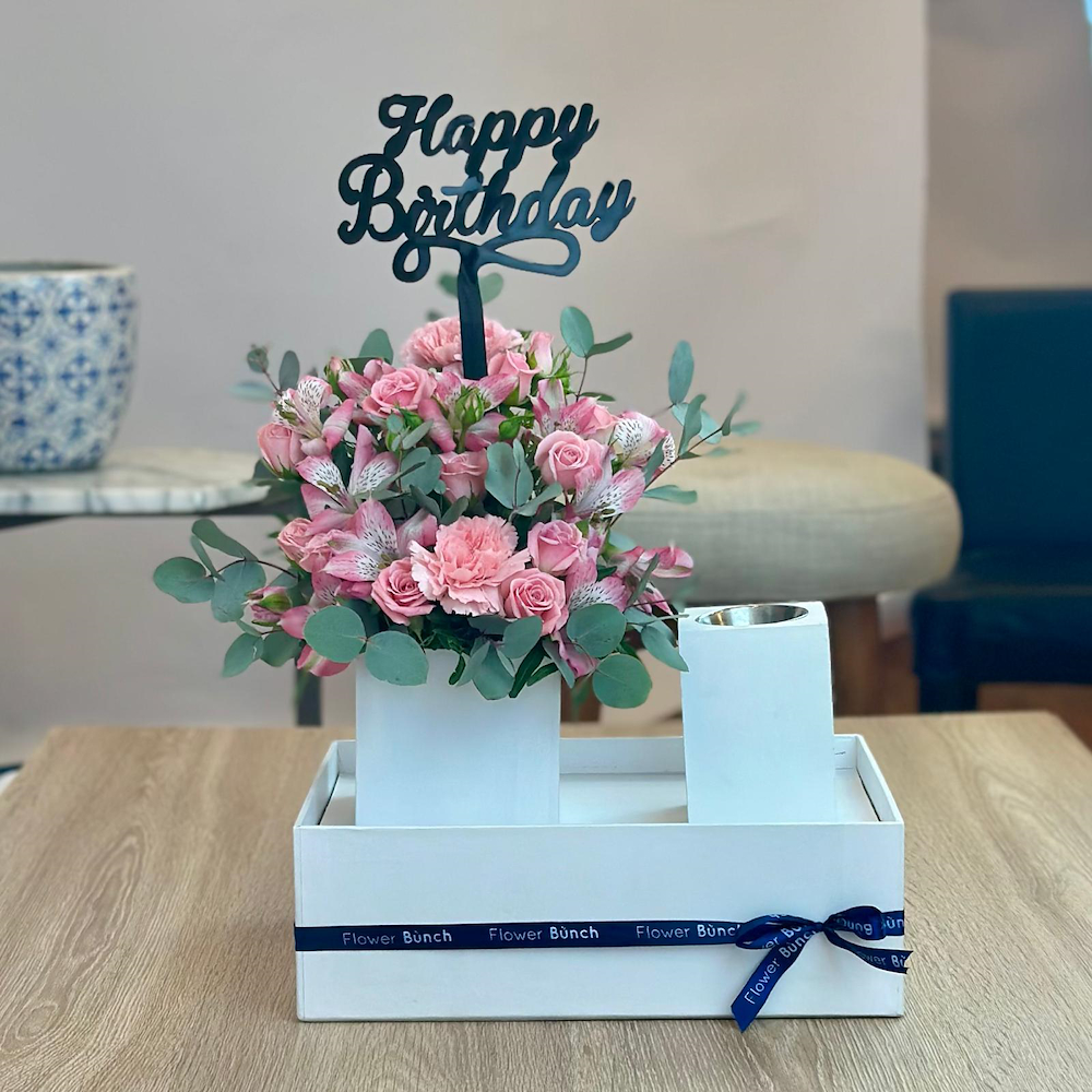 باقة مليئة بأزهار الجوري، الكريز والكارنيشن مع مبخر.