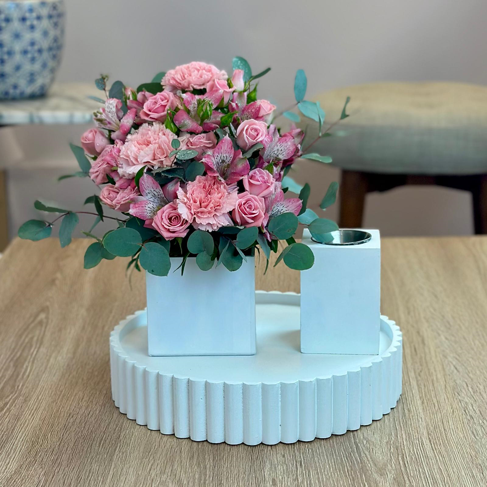 باقة مليئة بأزهار الجوري، الكريز والكارنيشن مع مبخر.