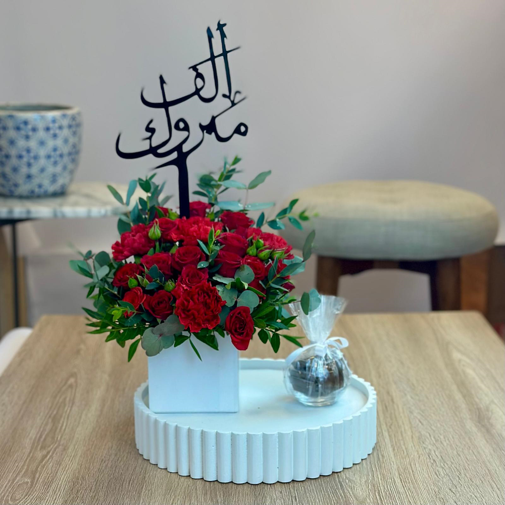 باقة مليئة بأزهار البيبي روز والكارنيشن مع الشوكولاتة.