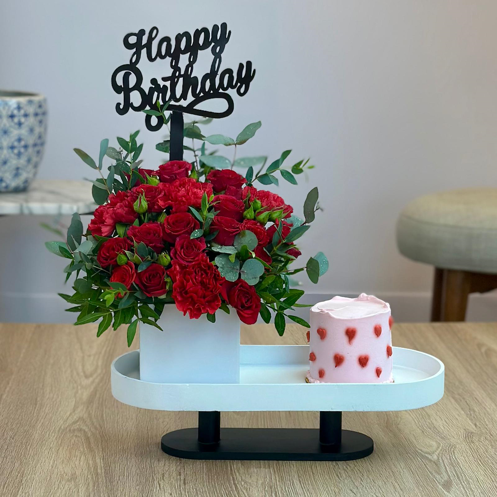 باقة تحتوي على زهور الكارنيشن والجوري مع كيكة، مرتبة بشكل جميل في صينية.