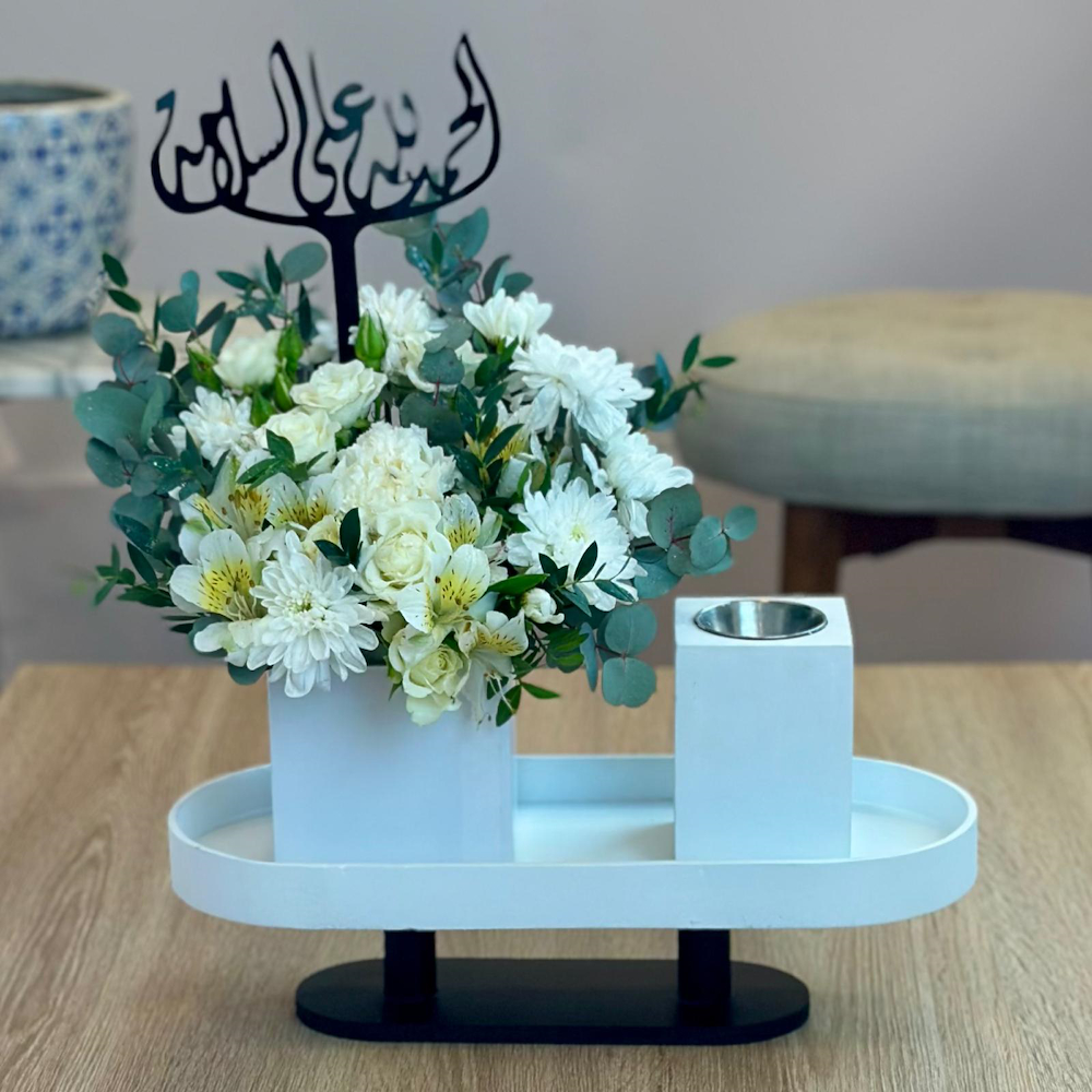 باقة مليئة بأزهار السترومريا والكريز مع مبخر.