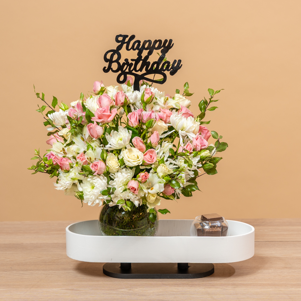 تحتوي هذه الباقة على زهور الجوري الوردية والبيضاء وزهور الكريز البيضاء، مصحوبة بشوكولاتة لذيذة. هدية مثالية لإسعاد شخص مميز.