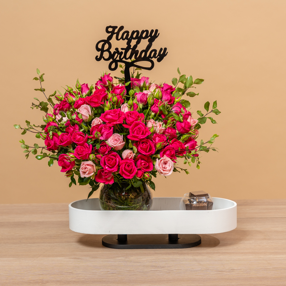تحتوي هذه الباقة على زهور الجوري الوردية، مصحوبة بشوكولاتة لذيذة. هدية مثالية لإسعاد شخص مميز.