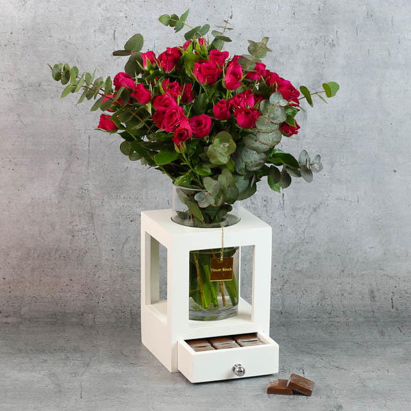 بوكيه يحتوي على زهور الجوري مع الشوكولاتة.