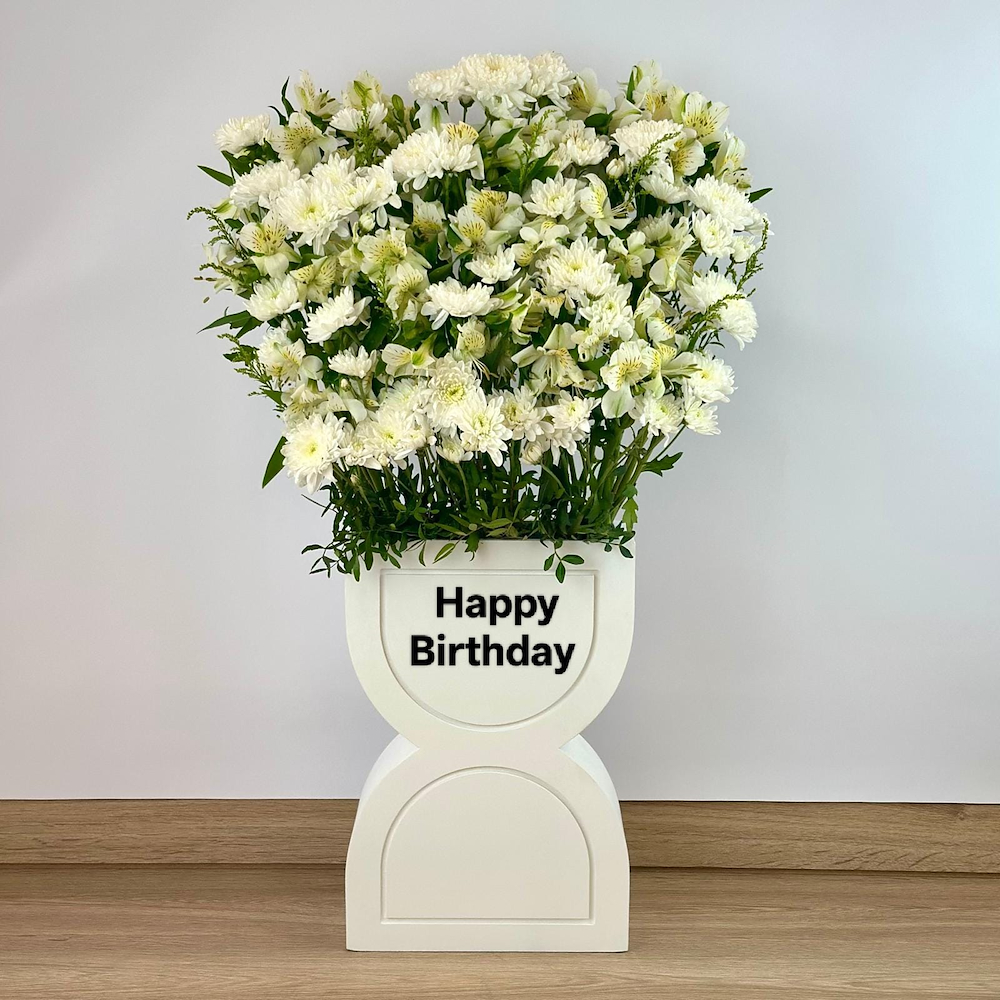 ستاند يحتوي على زهور الألستروميريا والكريز.