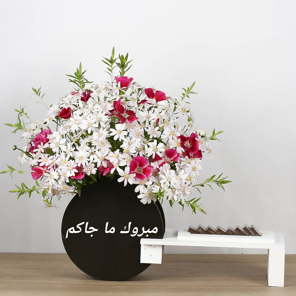 باقة مليئة بمزيج من الأزهار الجميلة مع الشوكولاتة.