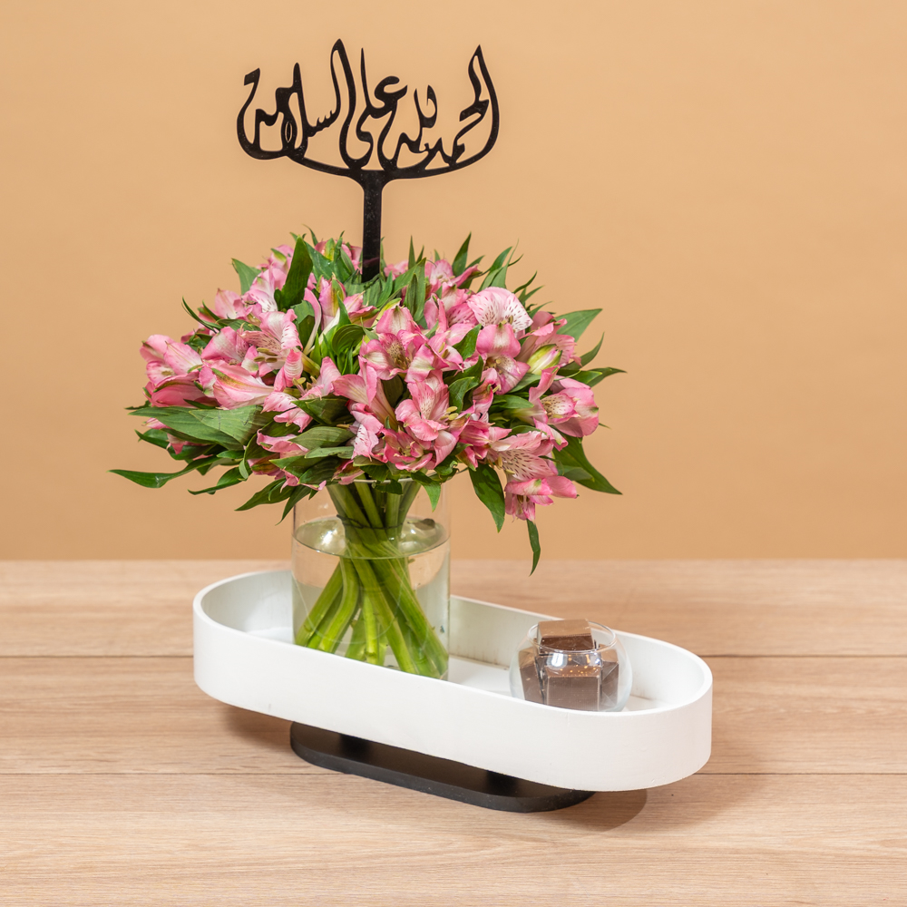 تحتوي هذه الباقة على زهور الألستروميريا الوردية، مصحوبة بشوكولاتة لذيذة. هدية مثالية لإسعاد شخص مميز.