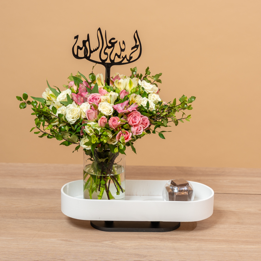 تحتوي هذه الباقة على زهور البيبي جوري والألستروميريا، مصحوبة بشوكولاتة لذيذة. هدية مثالية لإسعاد شخص مميز.