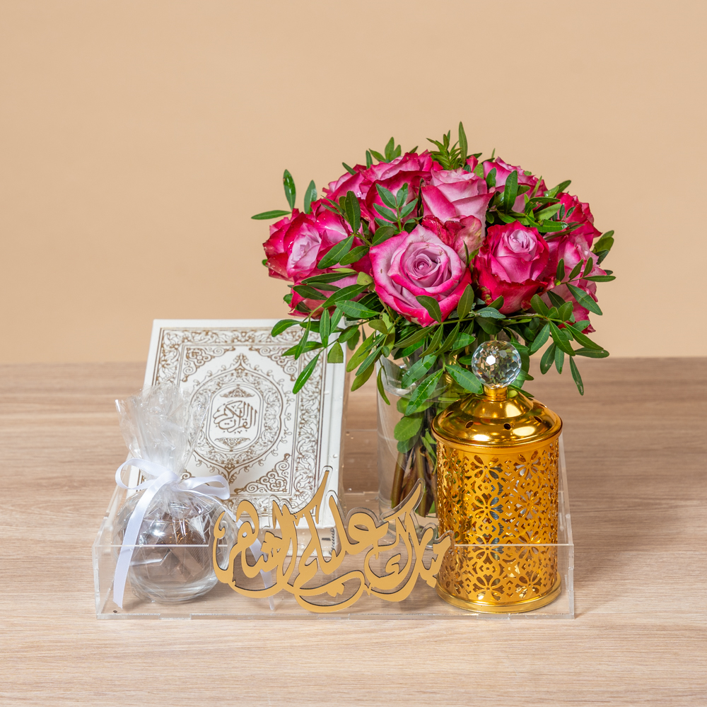 بوكس رمضان يحتوي علي المصحف الشريف وباقه من الزهور مع الشوكولاتة ومبخر قيم.