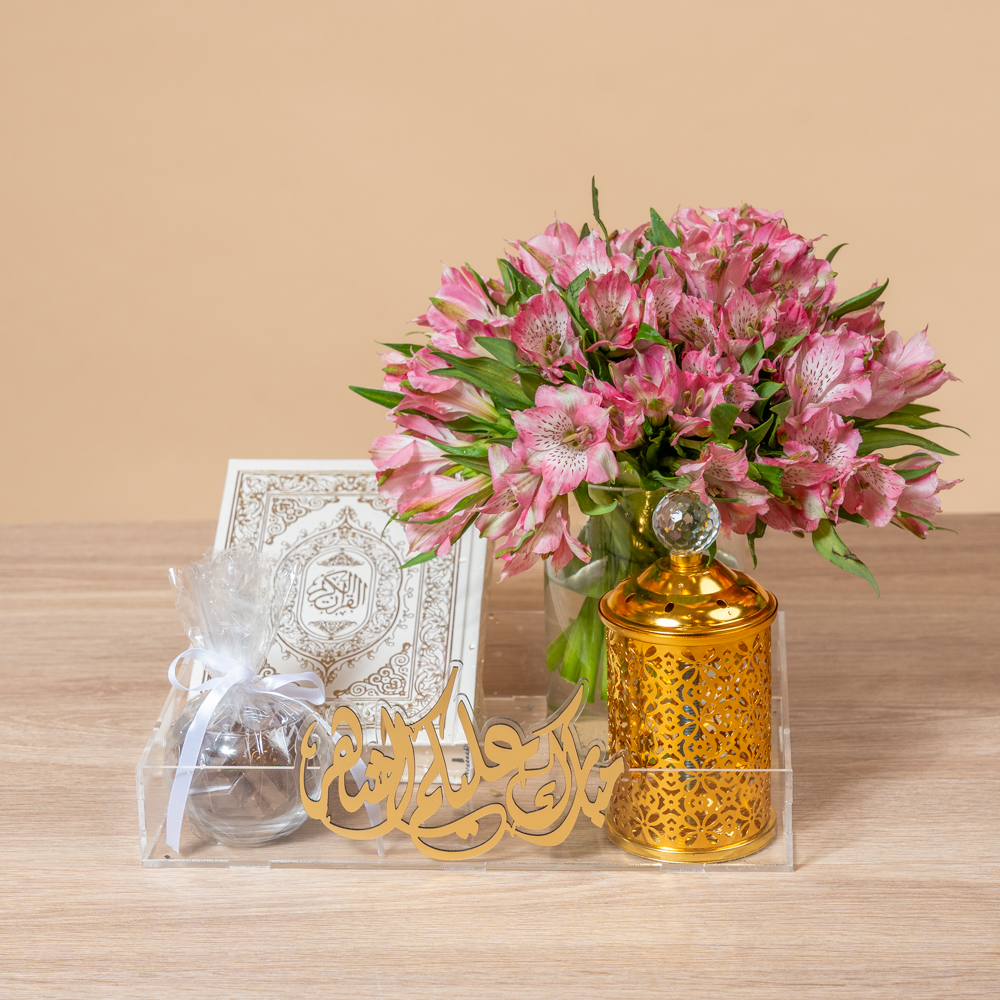 بوكس رمضان يحتوي علي المصحف الشريف وباقه من الزهور مع الشوكولاتة ومبخر قيم.