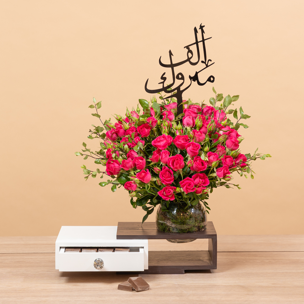 تحتوي هذه الباقة على زهور الجوري الوردية، مصحوبة بشوكولاتة لذيذة. هدية مثالية لإسعاد شخص مميز.