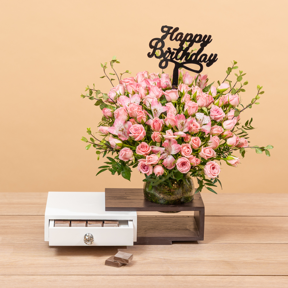 تحتوي هذه الباقة على زهور الجوري الوردي، مصحوبة بشوكولاتة لذيذة.