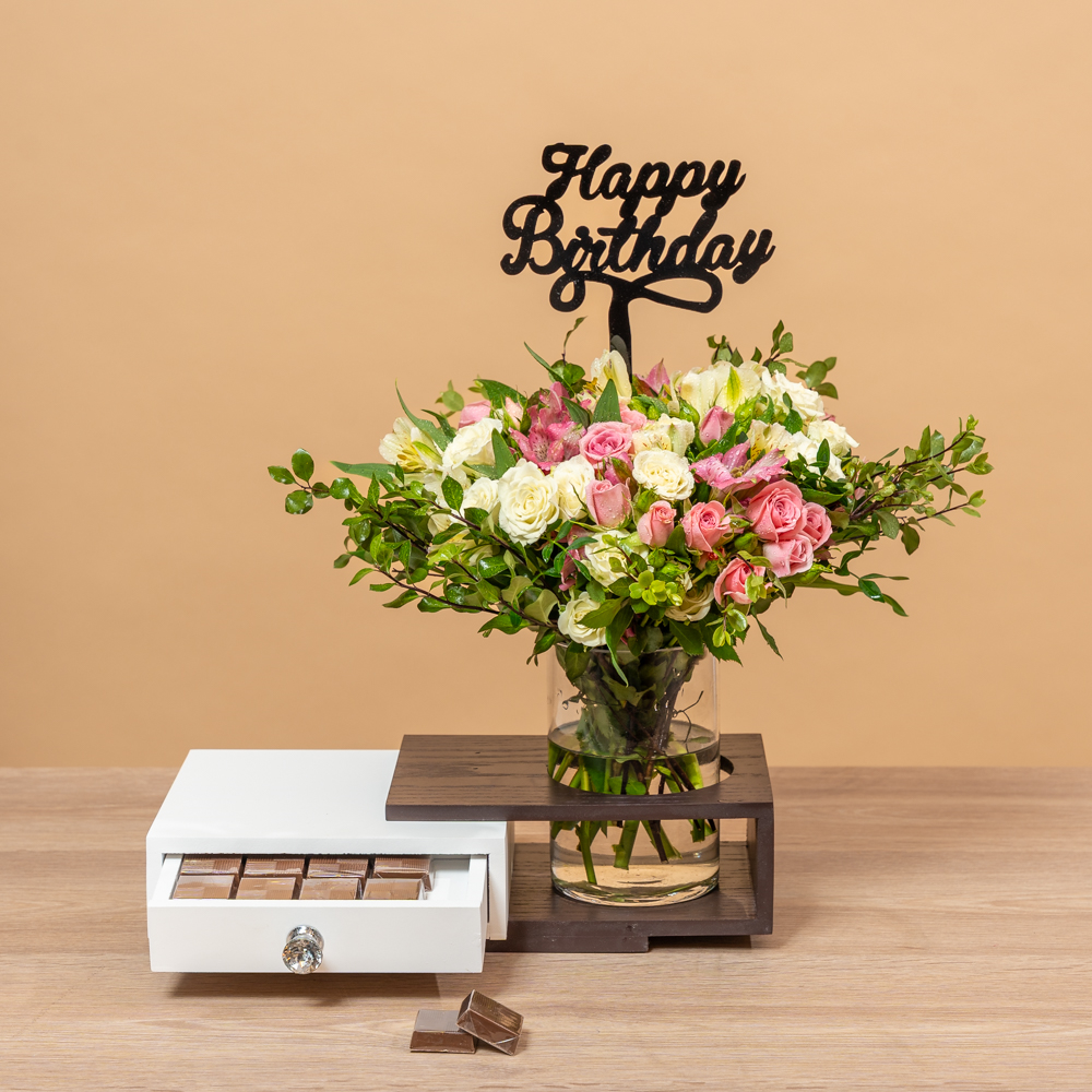 باقة تحتوي على الجوري والشوكولاتة.