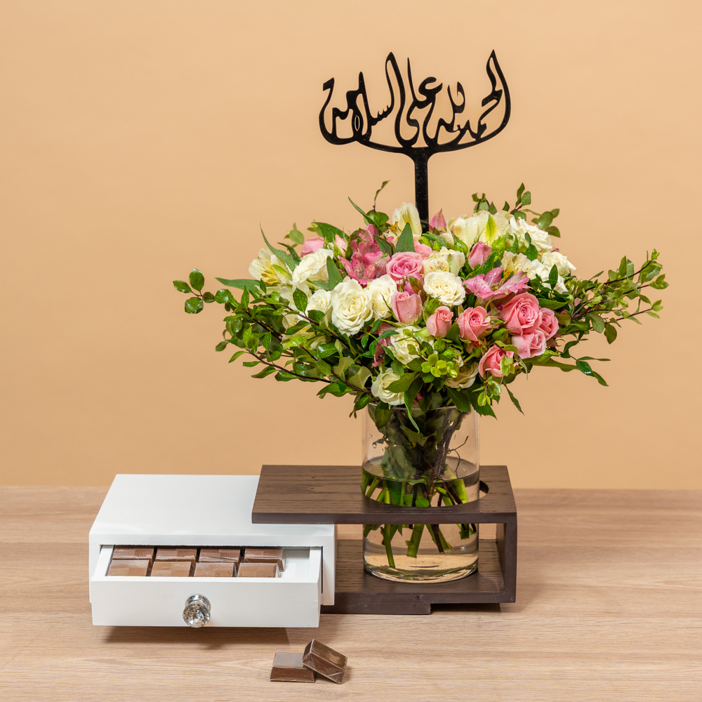تحتوي هذه الباقة على زهور الألستروميريا والجوري، مصحوبة بشوكولاتة لذيذة. هدية مثالية لإسعاد شخص مميز.