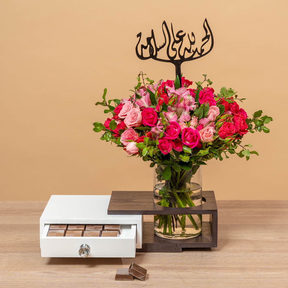 تحتوي هذه الباقة على زهور الجوري الوردية، مصحوبة بشوكولاتة لذيذة. هدية مثالية لإسعاد شخص مميز.