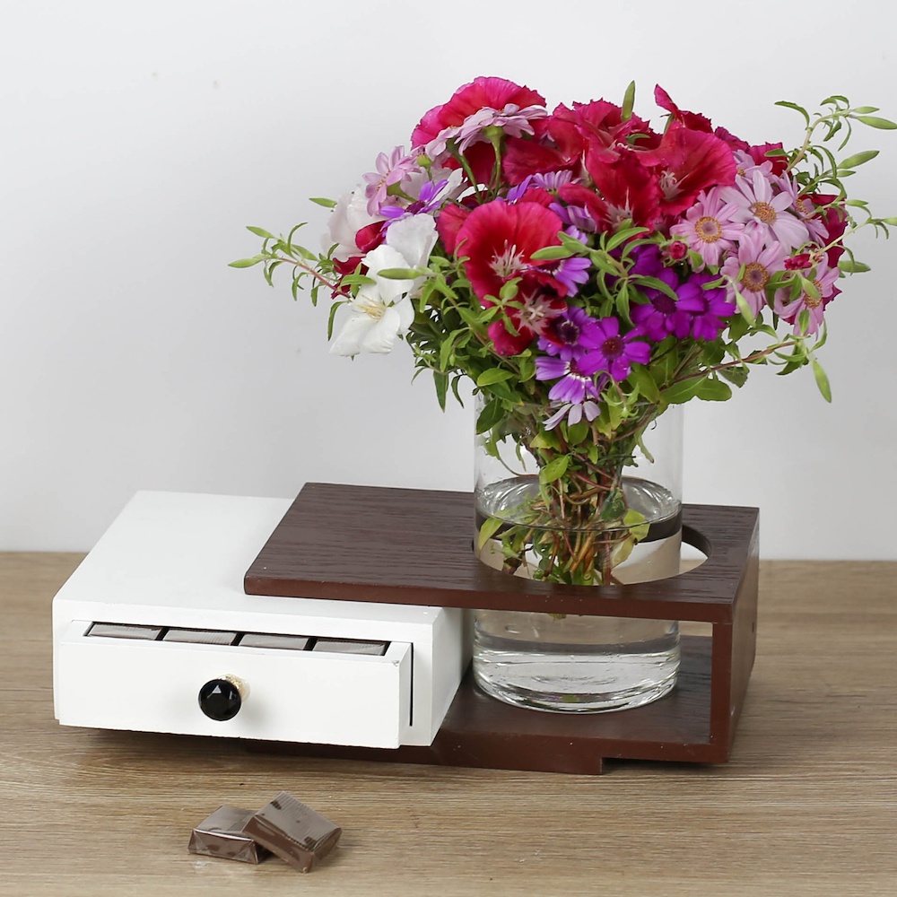 باقة تحتوي على زهور الكريز والساتين الجميلة مع الشوكولاتة.