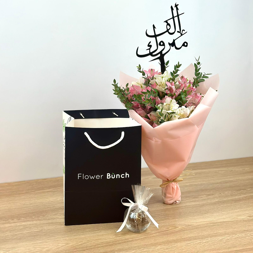 باقة يد مليئة بأزهار الستروميريا والأوراق الخضراء مع الشوكولاتة.