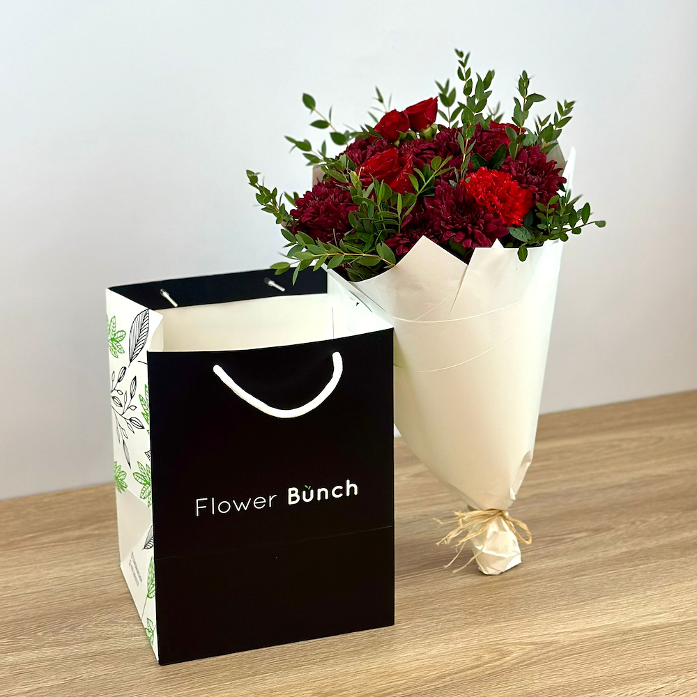 باقة يد تحتوي على زهور الروز والكريز والكارنيشن مع الخضار.