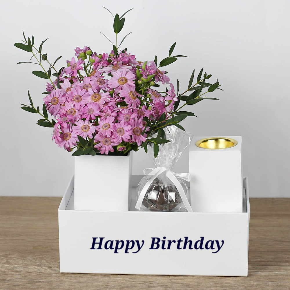 باقة مليئة بمزيج من الأزهار الجميلة مع مبخر والشوكولاتة.