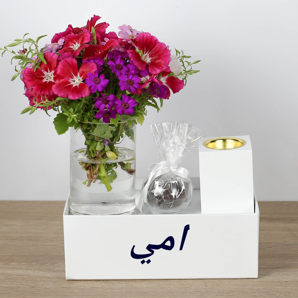 باقة تحتوي على زهور الكريز والساتين الجميلة مع مبخر والشوكولاتة.