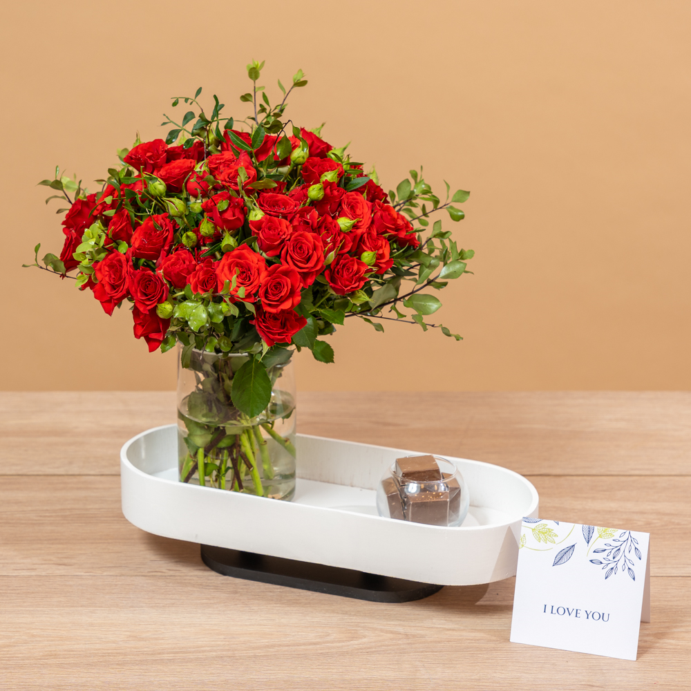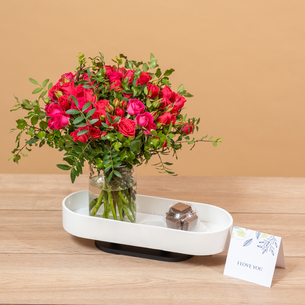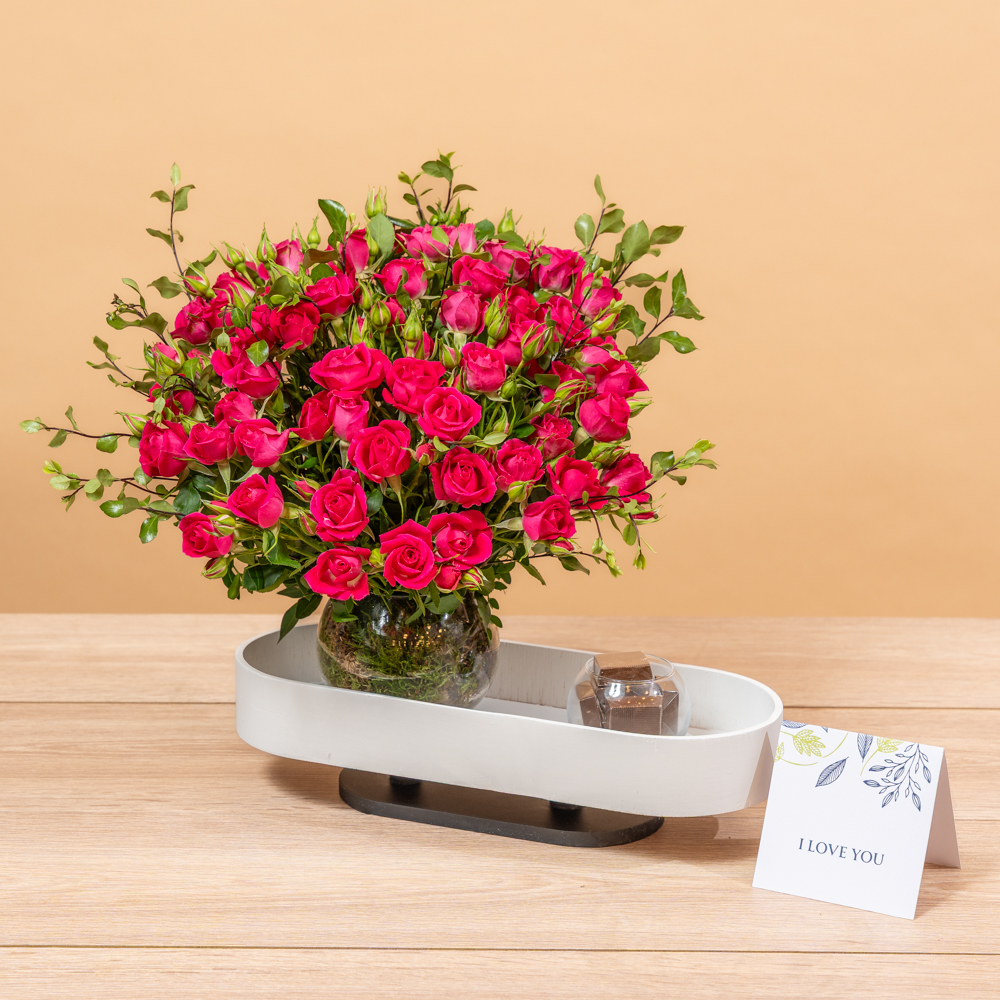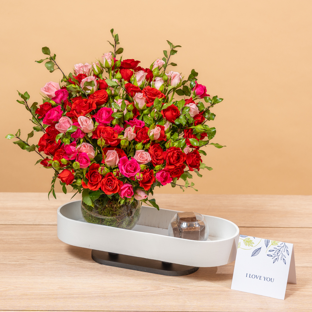 ستاند يحتوي على زهور الألستروميريا والكريز.