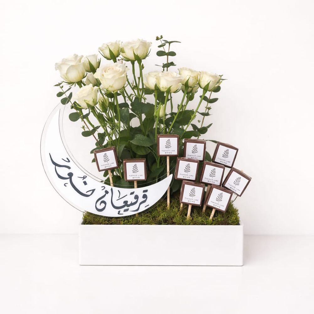 بوكس يتميز للقرقيعان يحتوي على أزهار البيبي روز و 10 قطع من الشوكولاتة مع الاسم المخصص.