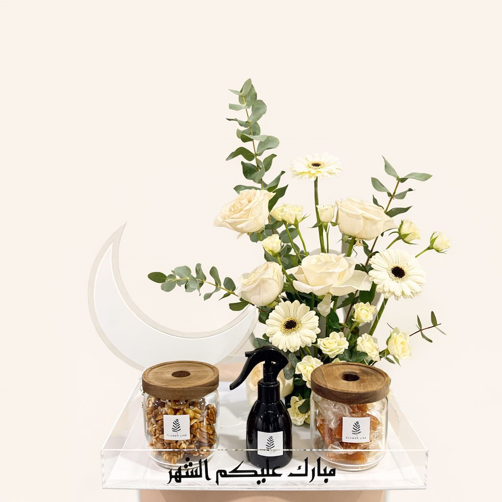 باقة تحتوي على الجوري والبيبي جوري، مرتبة بشكل جميل في صندوق من الأكريليك مع مرش للمنزل، جرة السبال مع العسل وجرة قمر الدين.