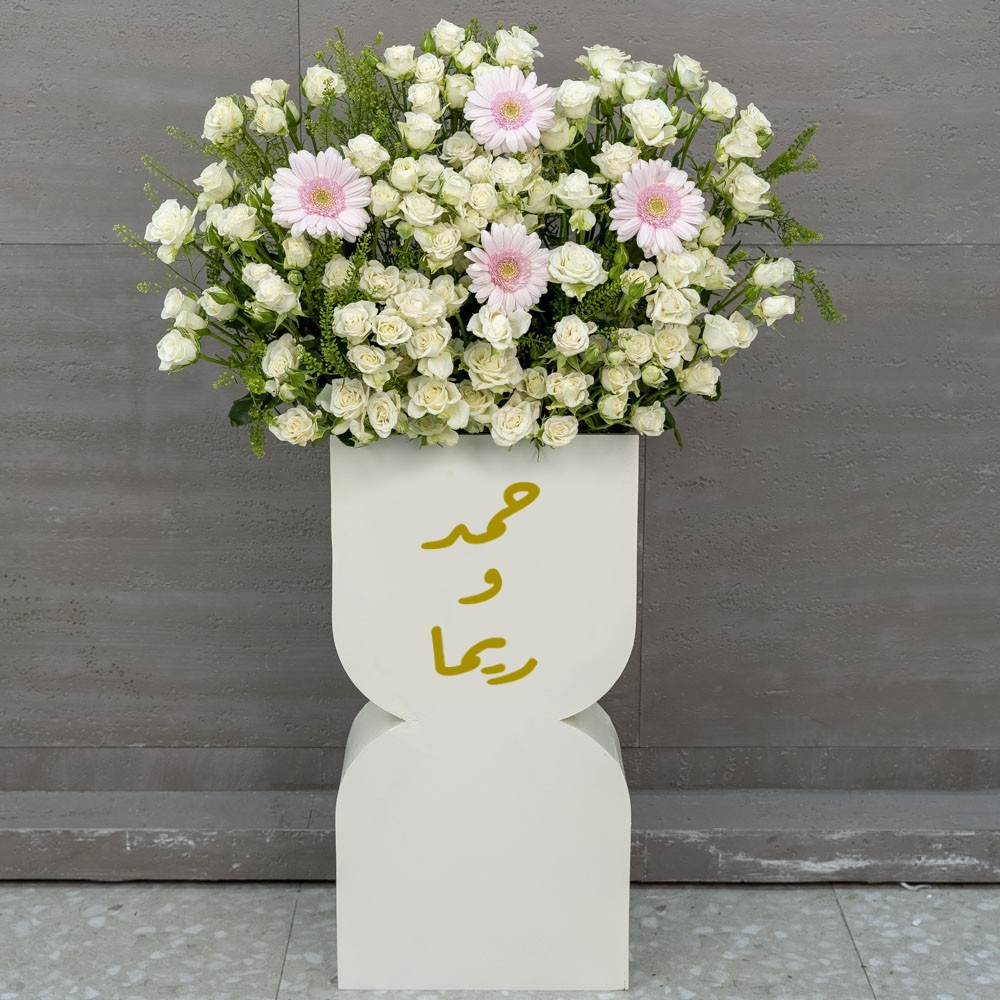 ستاند يحتوي على أزهار الجيربيرا والبيبي روز.