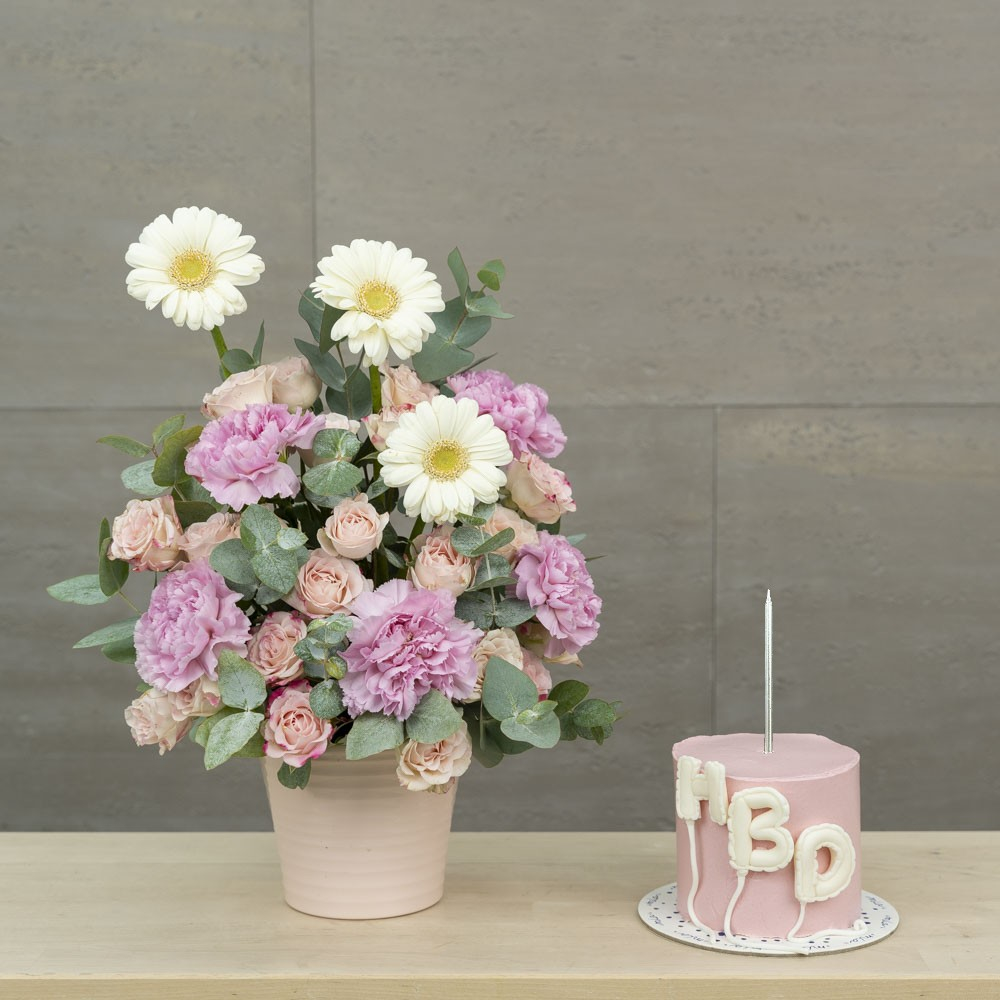 هذه الباقة تحتوي على جيربيرا، البيبي جوري والكارنيشن مع كيكة الشوكولاتة.