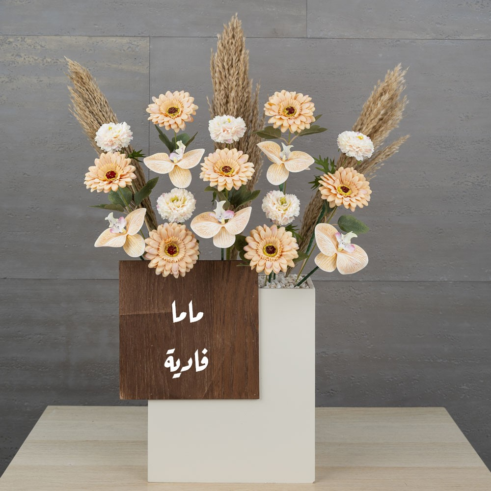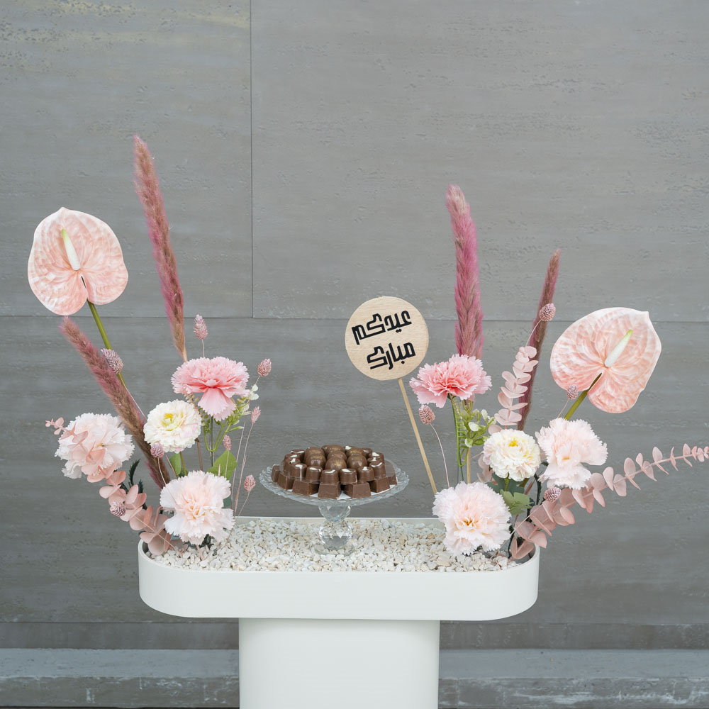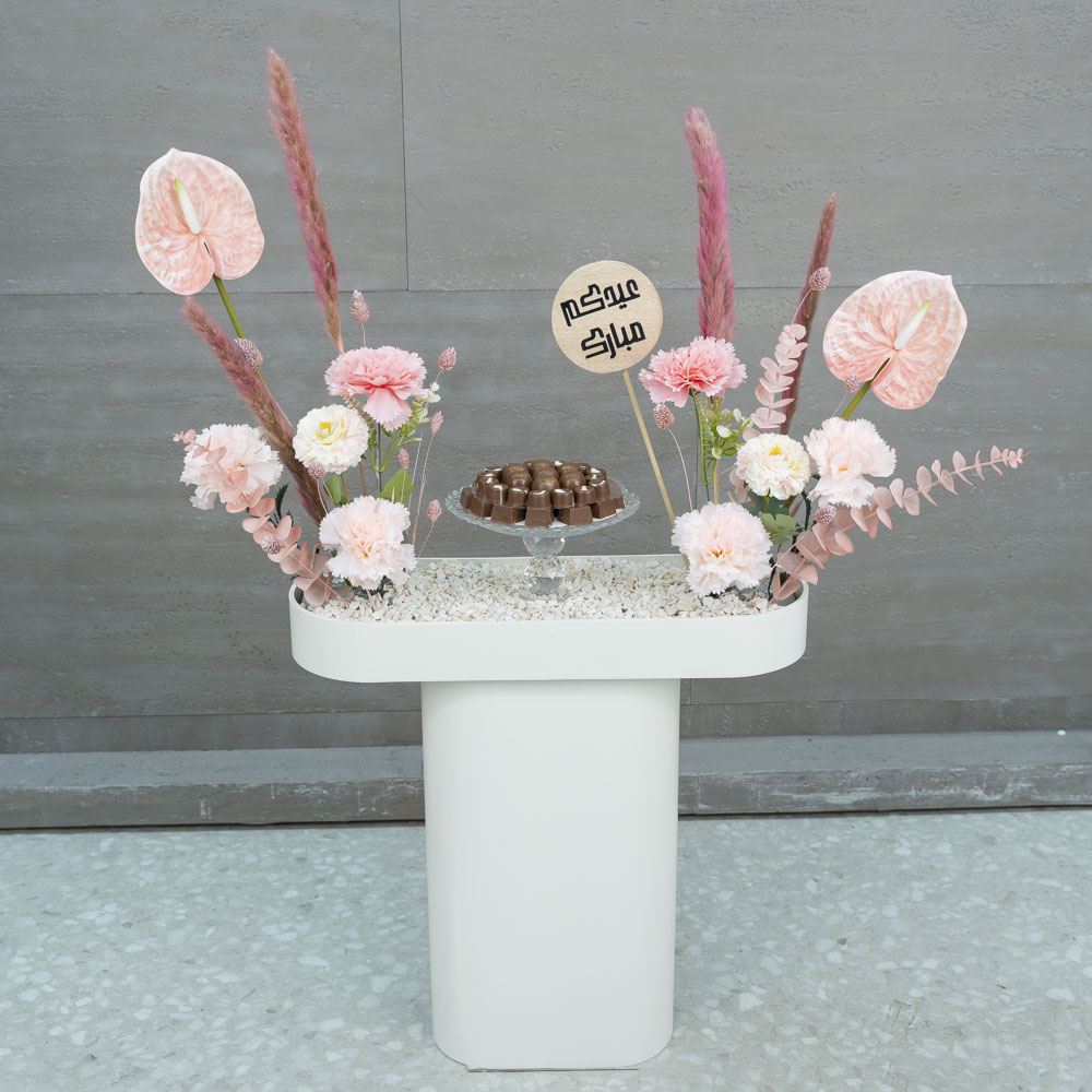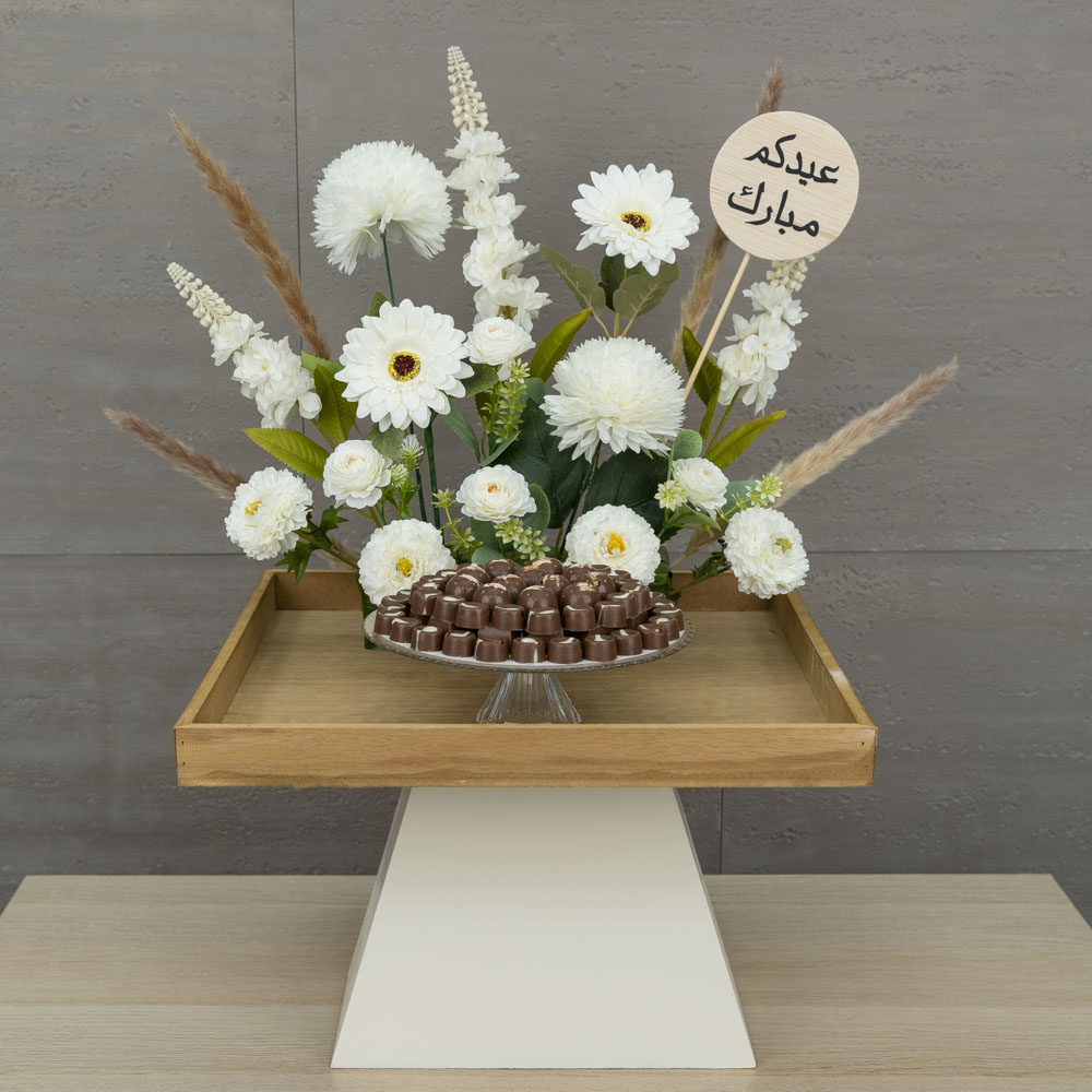 ستاند خشبي بتصميم جميل يحتوي على زهور صناعية ومحفوظة مع طبق من الشوكولاتة الفاخرة اللذيذة.