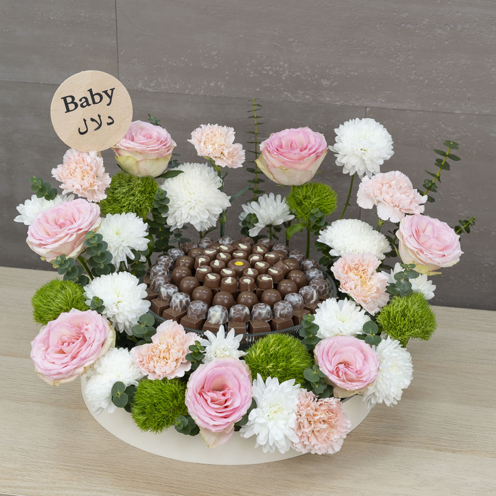 صينية تحتوي على الجوري، الكارنيشن والكريز مع الشوكولاتة.
