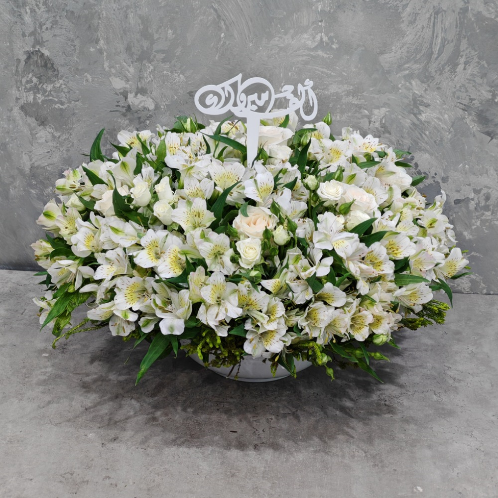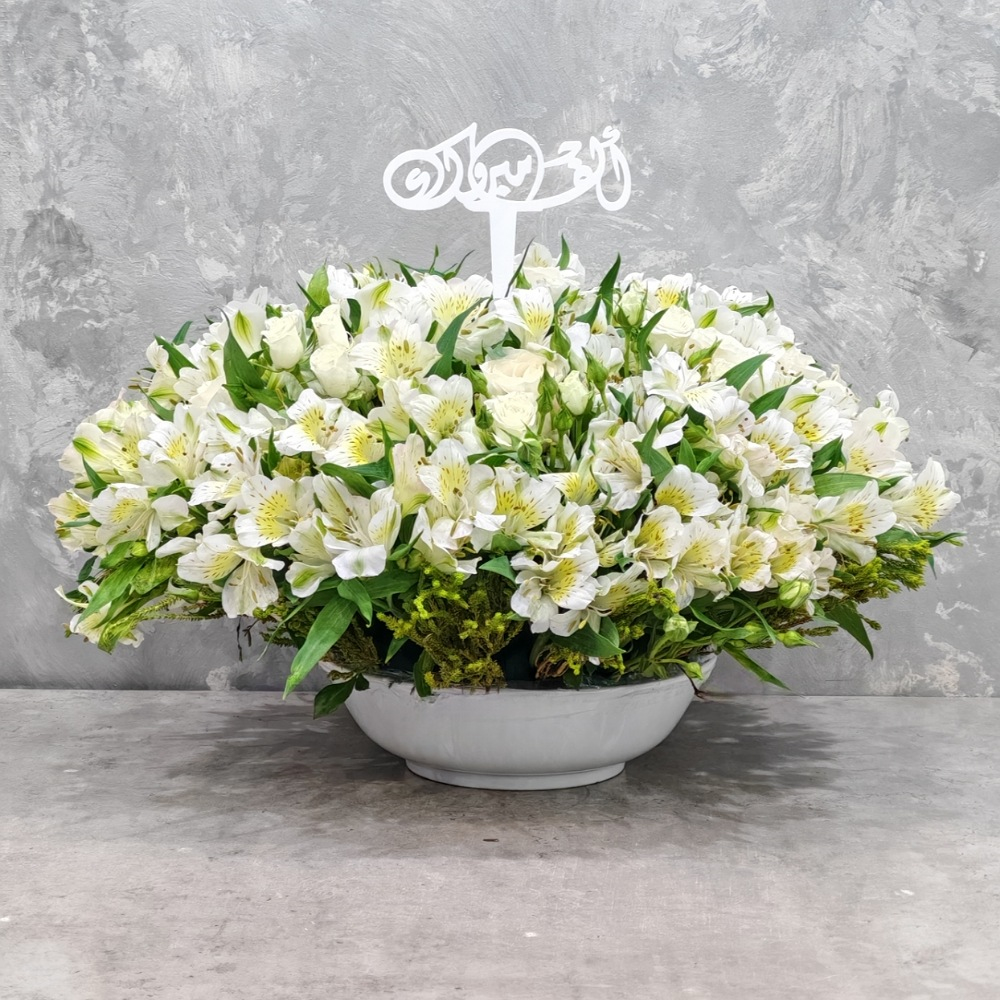 باقة تحتوي على زهور الألستروميريا الوردية، مرتبة بشكل جميل في فازة.